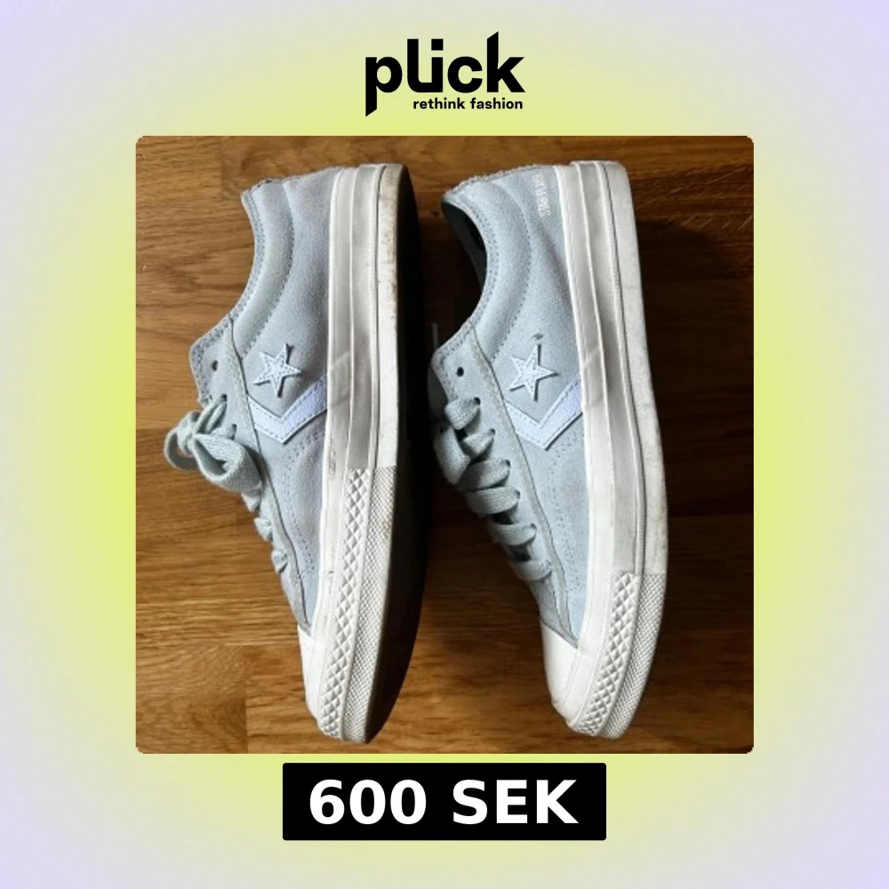 Säljer ett par ljusblå Converse One Star sneakers i mocka med vit sula och klassisk stjärndetalj på sidan. Skorna har snörning och en platt sula, perfekta för en avslappnad och cool stil.