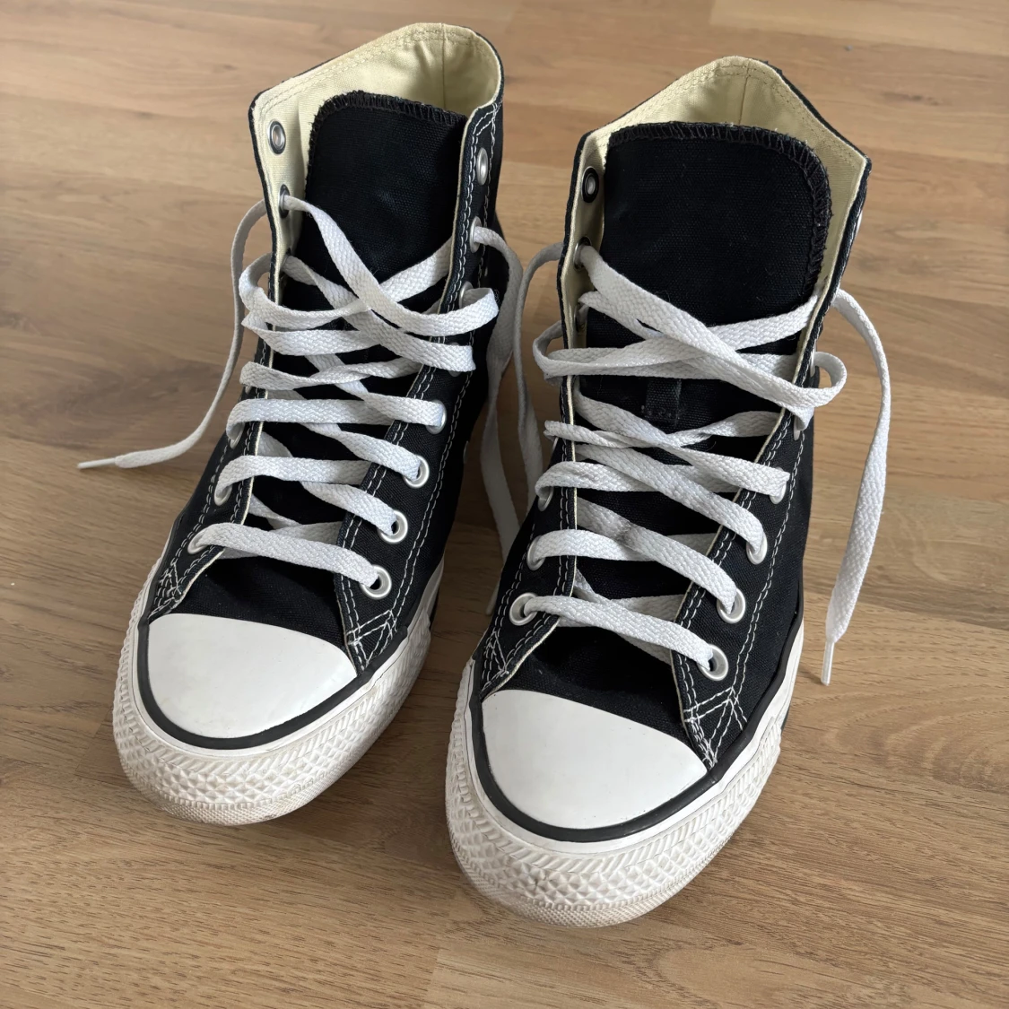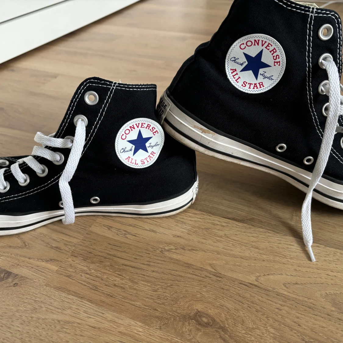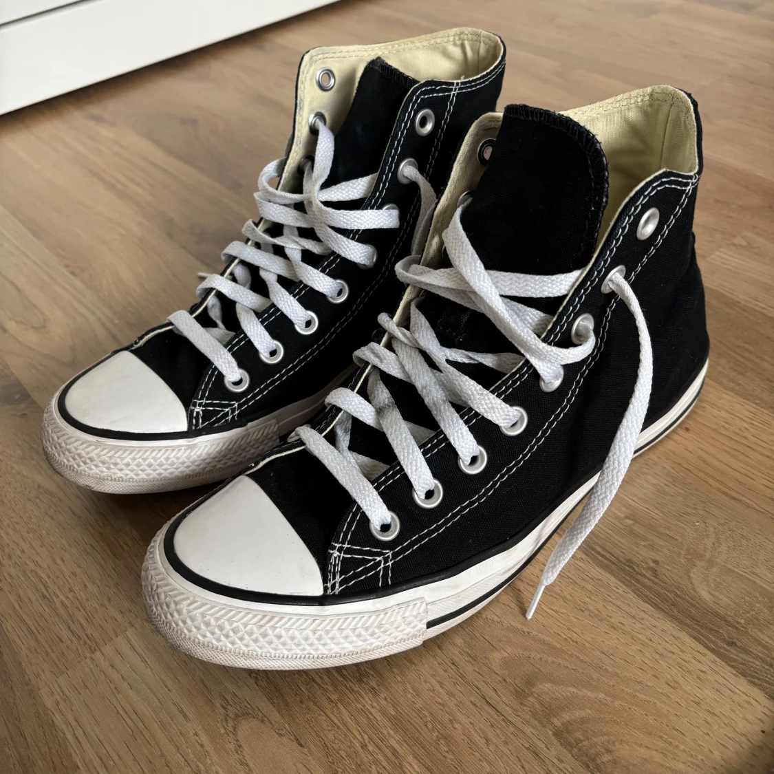Säljer ett par klassiska Converse Chuck Taylor All Star high tops i svart canvas med vita gummisulor och vita snören. Skorna har rund tå, platt sula och den ikoniska loggan på sidan. Perfekt för dig som gillar retrostil och vill ha ett par tidlösa sneakers.