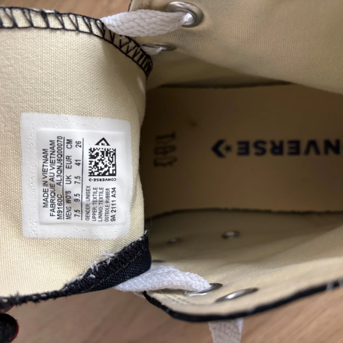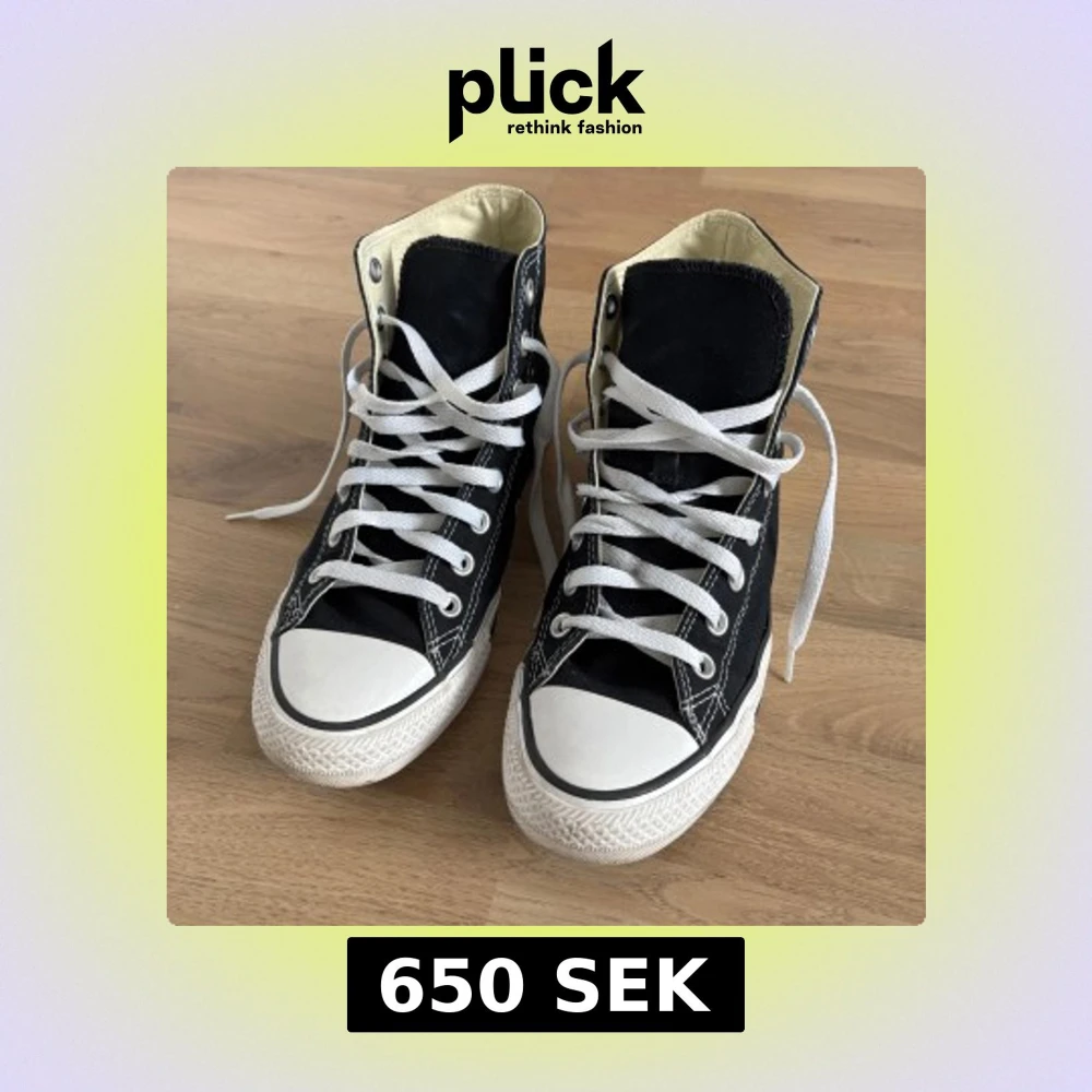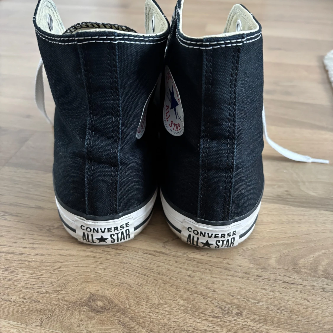 Säljer ett par klassiska Converse Chuck Taylor All Star high tops i svart canvas med vita gummisulor och vita snören. Skorna har rund tå, platt sula och den ikoniska loggan på sidan. Perfekt för dig som gillar retrostil och vill ha ett par tidlösa sneakers.