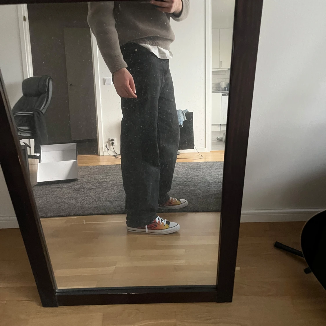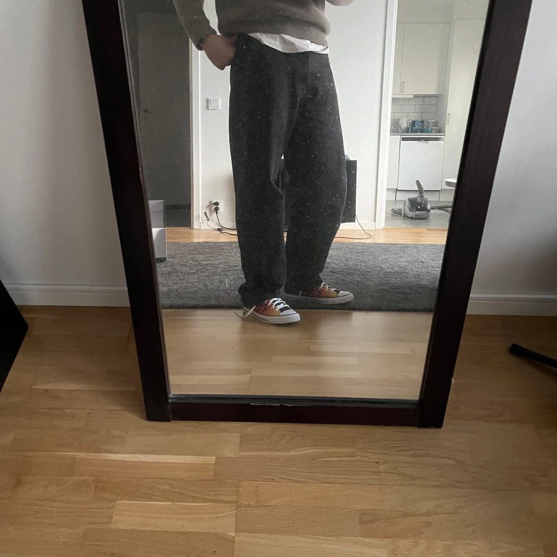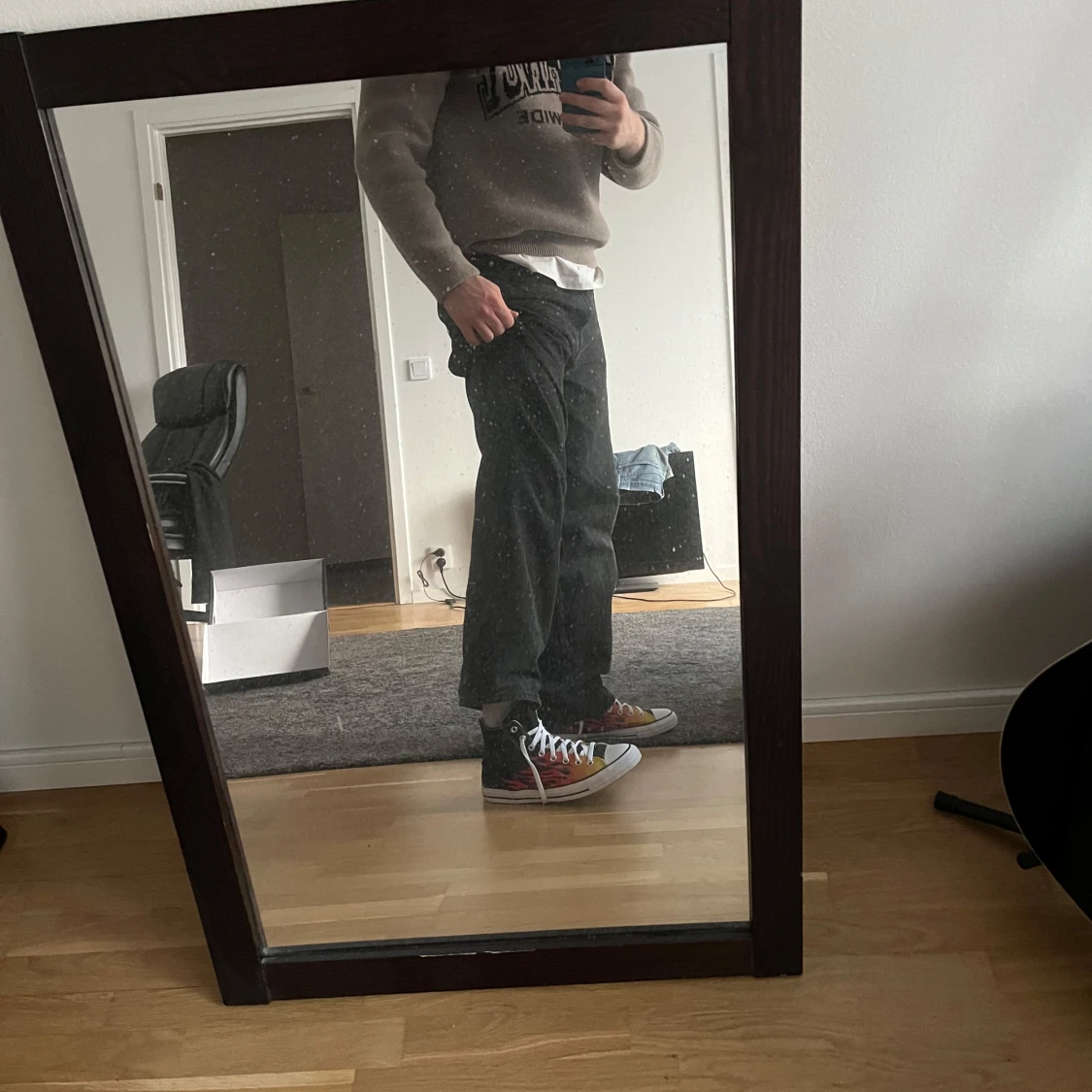 Säljer ett par coola svarta sneakers med en eldflamma-design i rött.