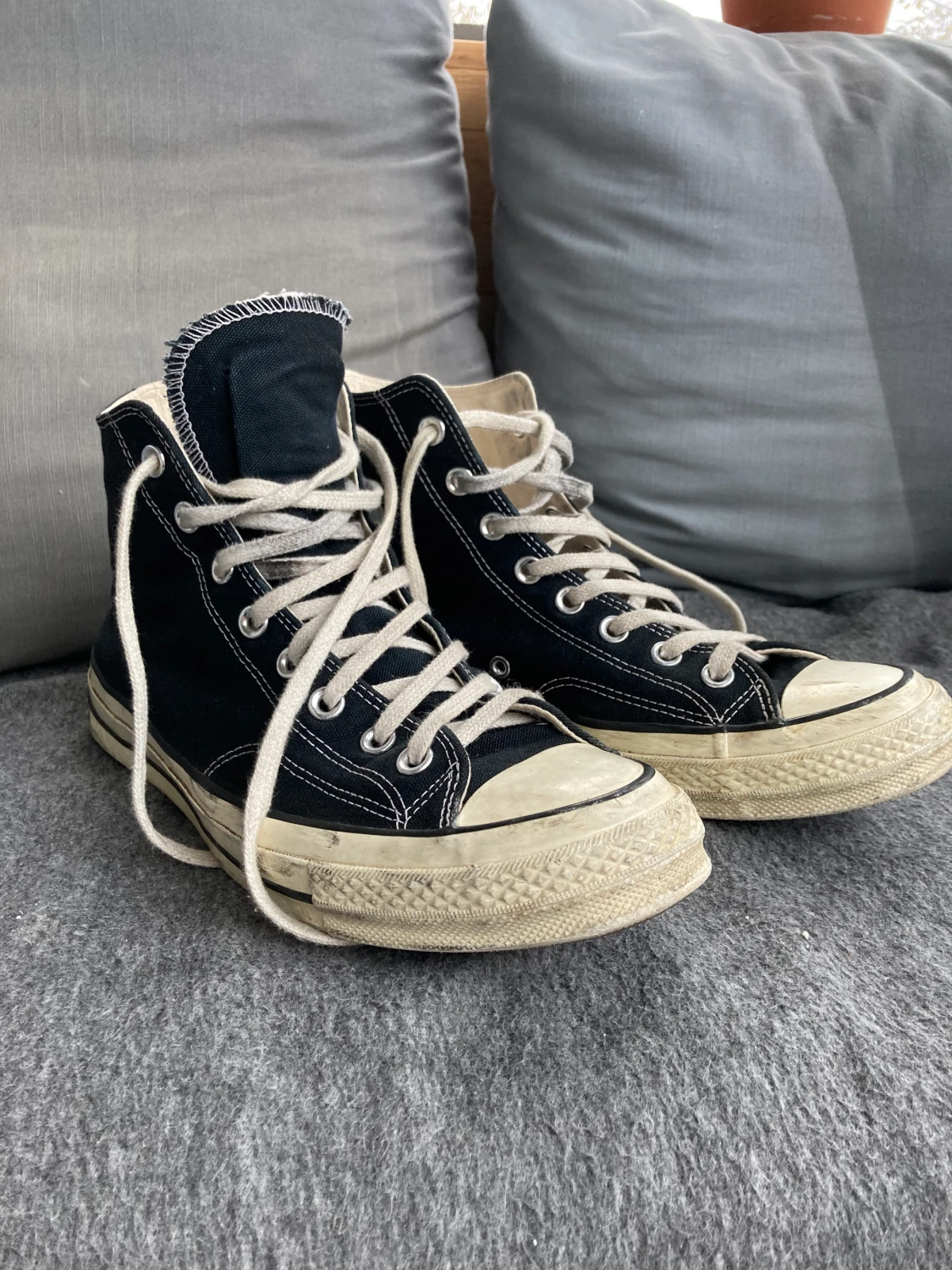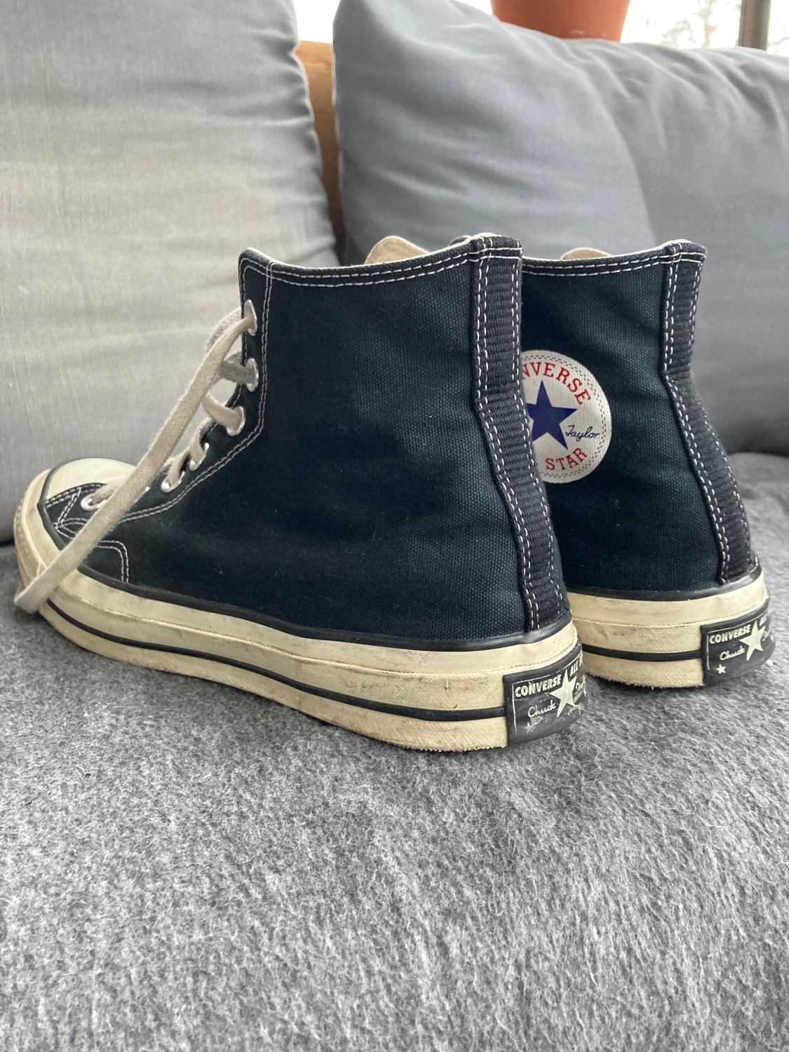 Svarta höga converse Strlk 42,5 Bra skick, väldigt lite använda. Finns i Umeå kan skickas.