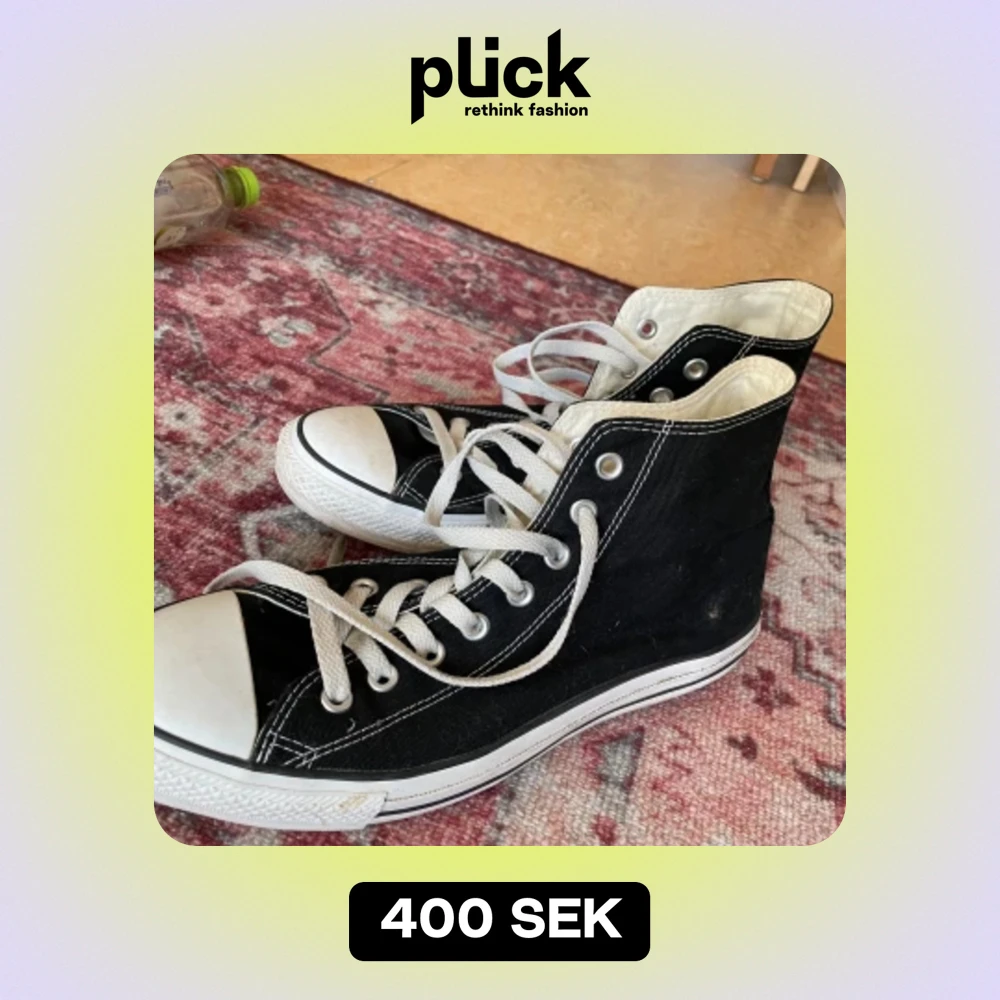 Nästan helt oanvända svarta Converse. Inte skador alls :) Mvh Elna