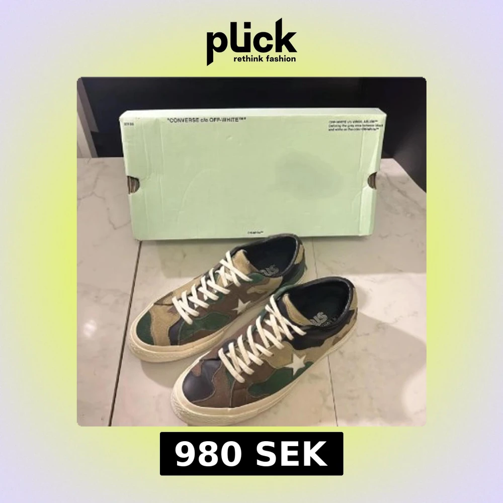 Säljer ett par Converse x Off-White One Star sneakers med camouflage-mönster i grönt, beige, brunt och svart. Skorna har vit stjärndetalj på sidan, vita snören och platt sula. Perfekta för dig som gillar streetwear och unika samarbeten.