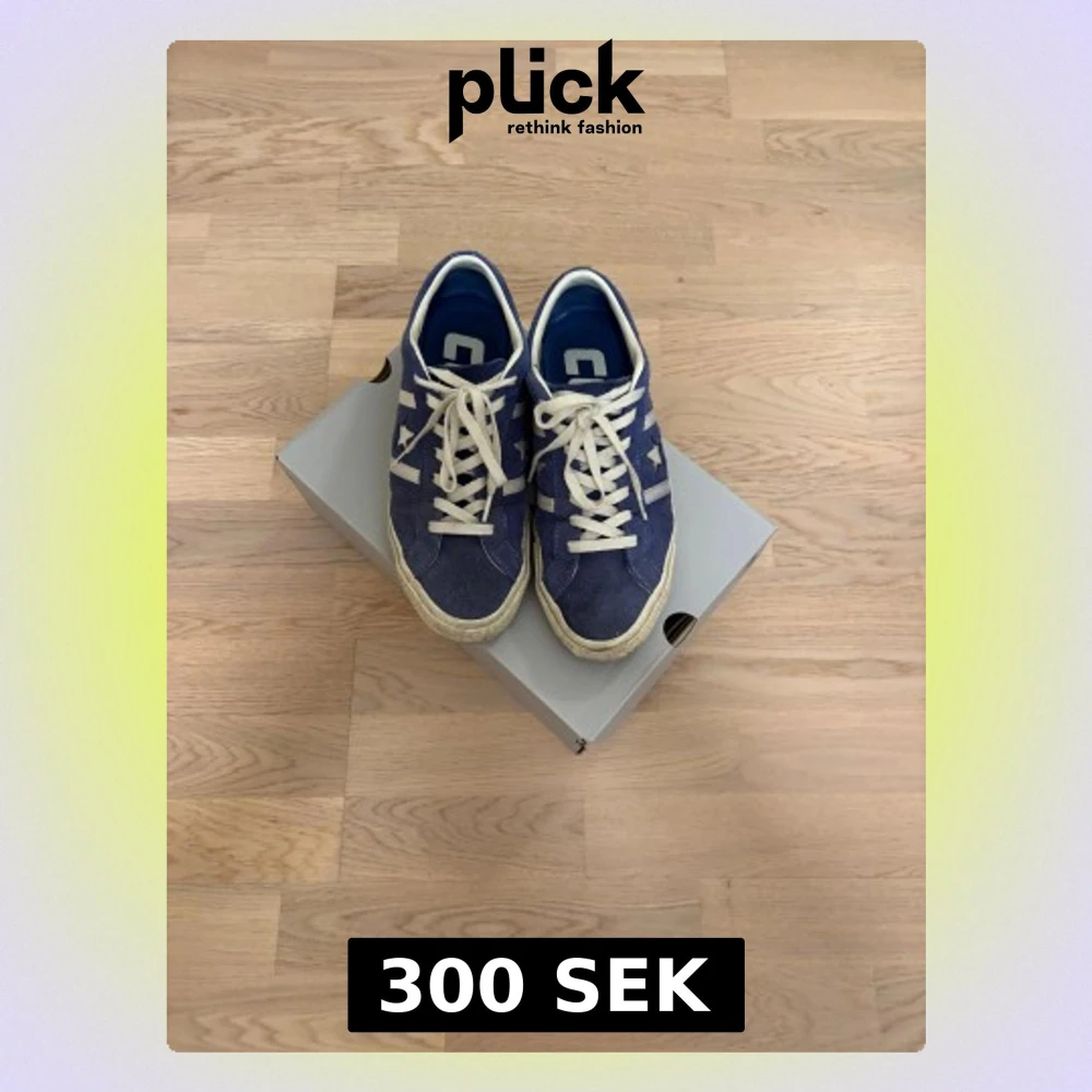 Säljer ett par blå Converse CONS sneakers med vit sula och vita snören. Skorna har klassisk stjärndesign på sidan och är tillverkade i mocka för en cool och retro vibe. Perfekta för dig som gillar streetstyle och vill ha något som sticker ut. Skorna är bra överlag utöver yt smutset men det går bort enkelt med lite skrubbande.