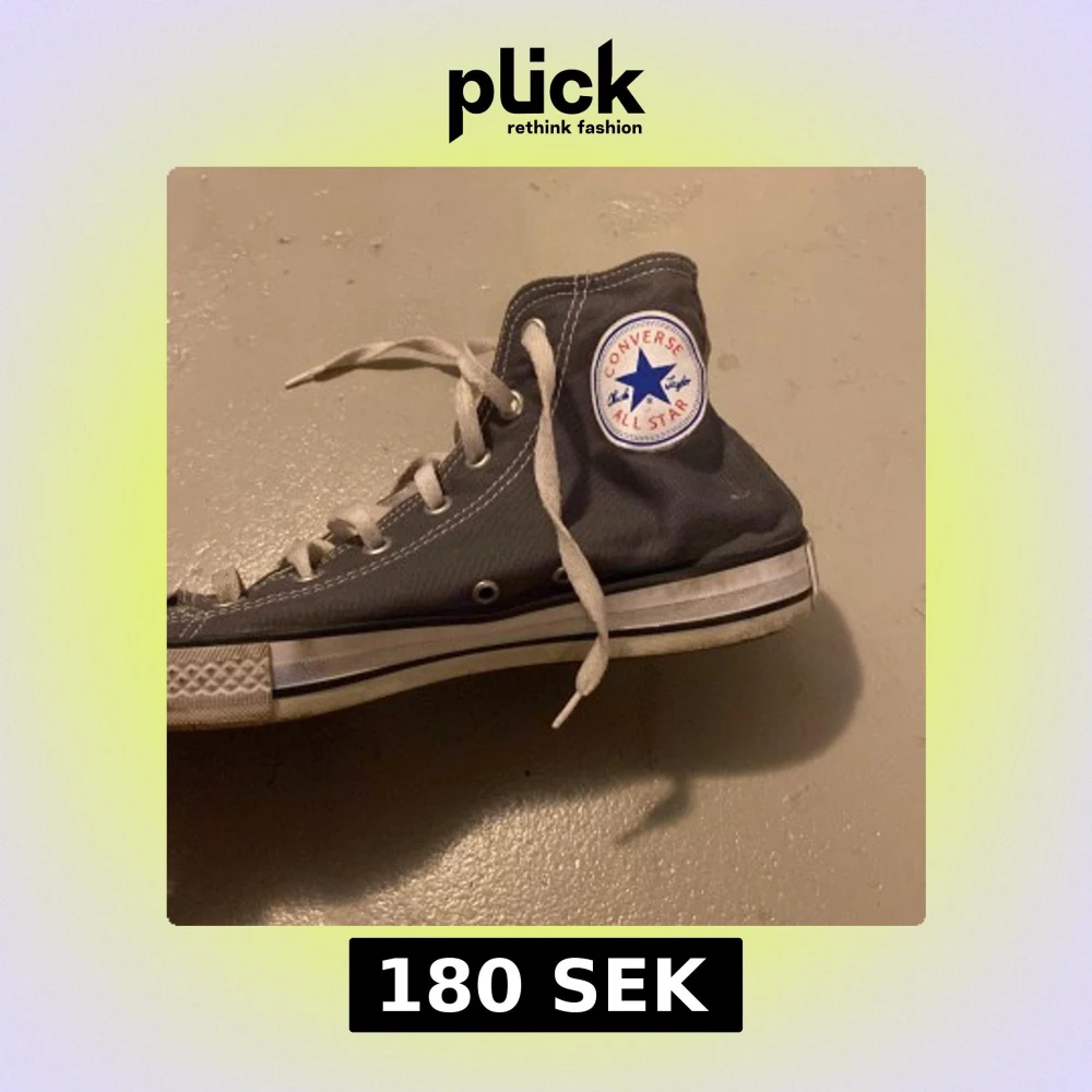 Säljer ett par TVÄR FETA klassiska höga Converse Chuck Taylor All Star i grått tyg med vita snören och gummisula. Skorna har rund tå, snörning och den ikoniska loggan på sidan. Perfekta för dig som gillar en tidlös streetstil.