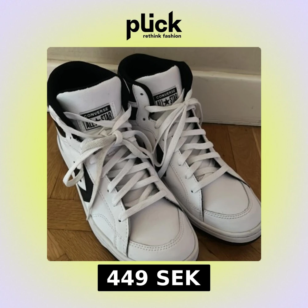 Säljer ett par vita Converse All Star sneakers med svart detalj och högt skaft. Skorna har klassisk snörning och den ikoniska stjärnan på sidan. Perfekta för dig som gillar streetstyle och vill ha en tidlös look.