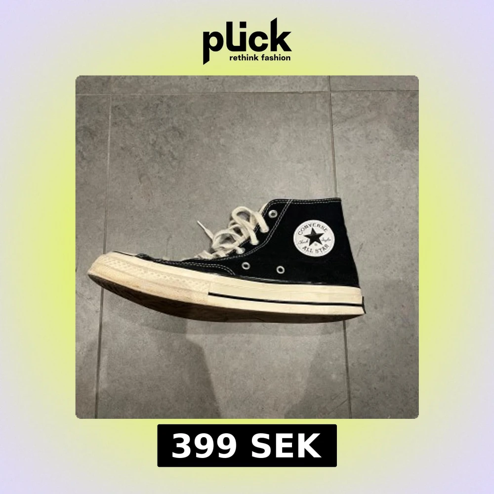 Klassiska svarta Converse All Star sneakers med hög snörning och vit sula. Skorna har den ikoniska logotypen på sidan och är perfekta för en avslappnad stil. Inuti vänster sko så har lite tyg lossnat vid ovansidan av hälen typ, men inget som syns. Storlek 43.