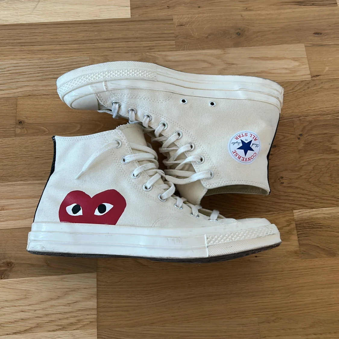 Snygga vita höga sneakers från converse x cdg. Skorna har klassisk snörning och en rund tå. Perfekta för en stilren och trendig look.