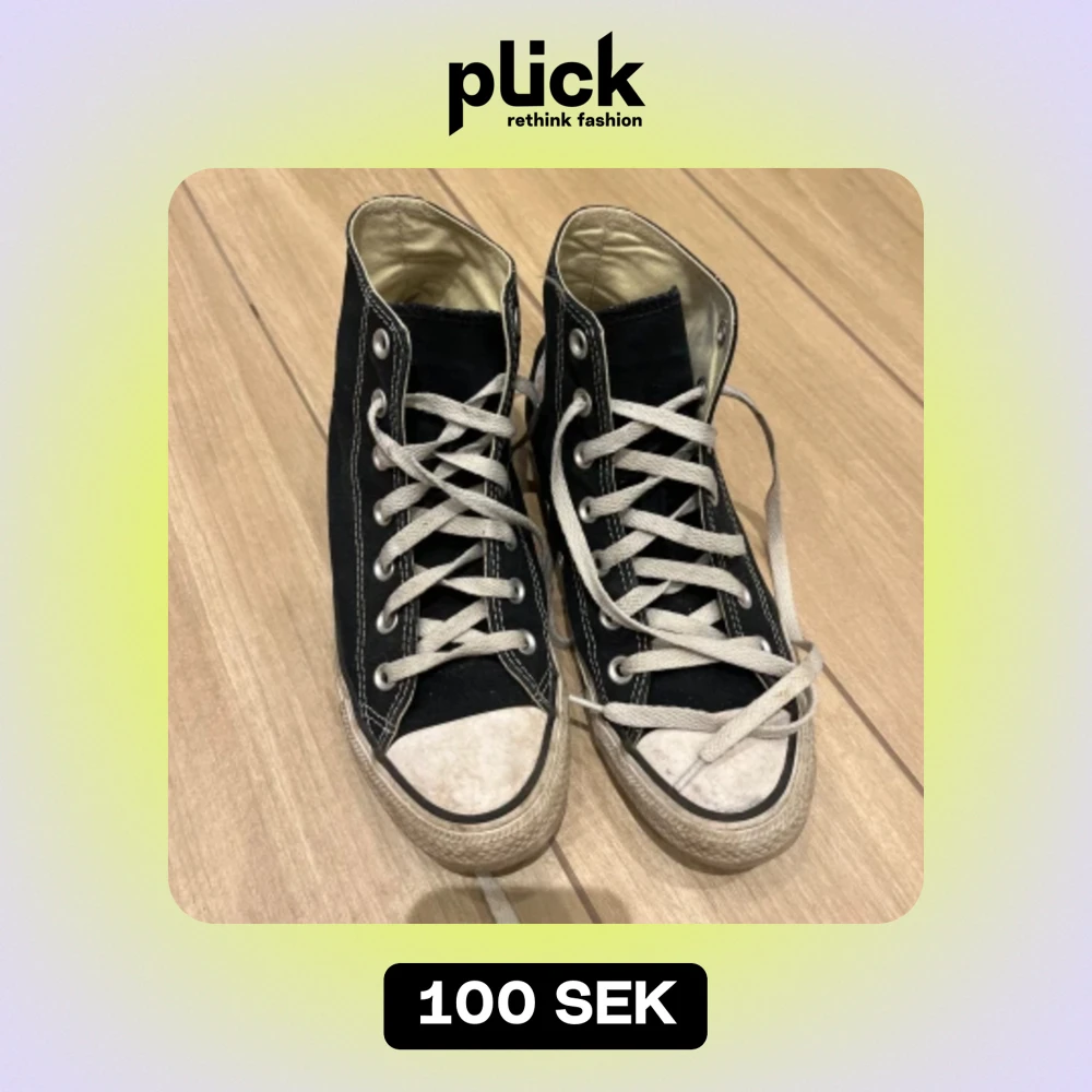 Säljer ett par svarta Converse All Star sneakers i storlek 39. Skorna är välanvända med vita snören och en vit sula som har blivit lite smutsig. De har den klassiska höga modellen med snörning och Converse-loggan på sidan. Perfekta för en casual look!