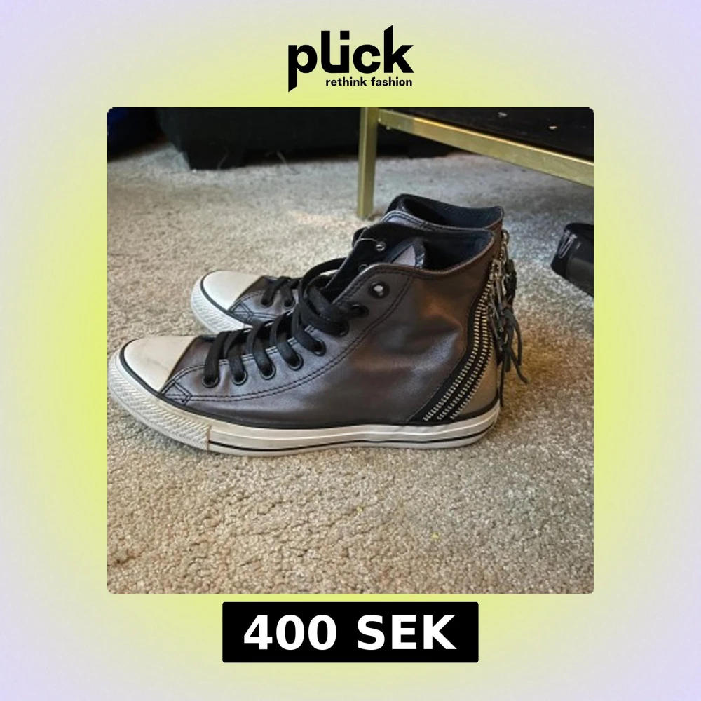 Snygga gråa Converse All Star i skinn med coola dragkedjor på baksidan. Klassisk design med snörning och vit sula. Perfekta för en stilren look med en twist.