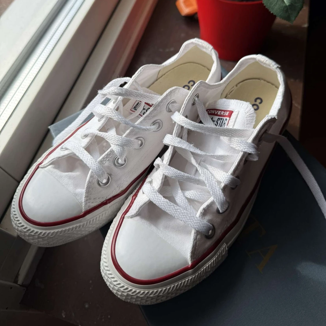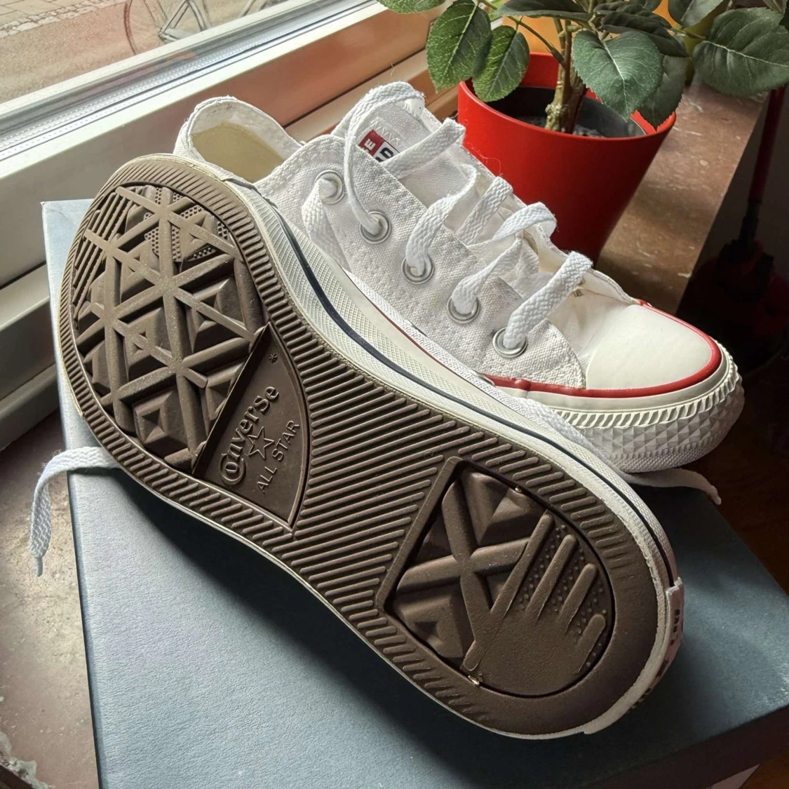 Säljer ett par klassiska Converse All Star sneakers i vitt med röda och svarta detaljer runt sulan. Skorna har snörning, rund tå och platt sula. Tillverkade i bomullstyg med gummisula. Perfekta för dig som gillar ikonisk streetstil och vill ha ett par schyssta låga sneakers.