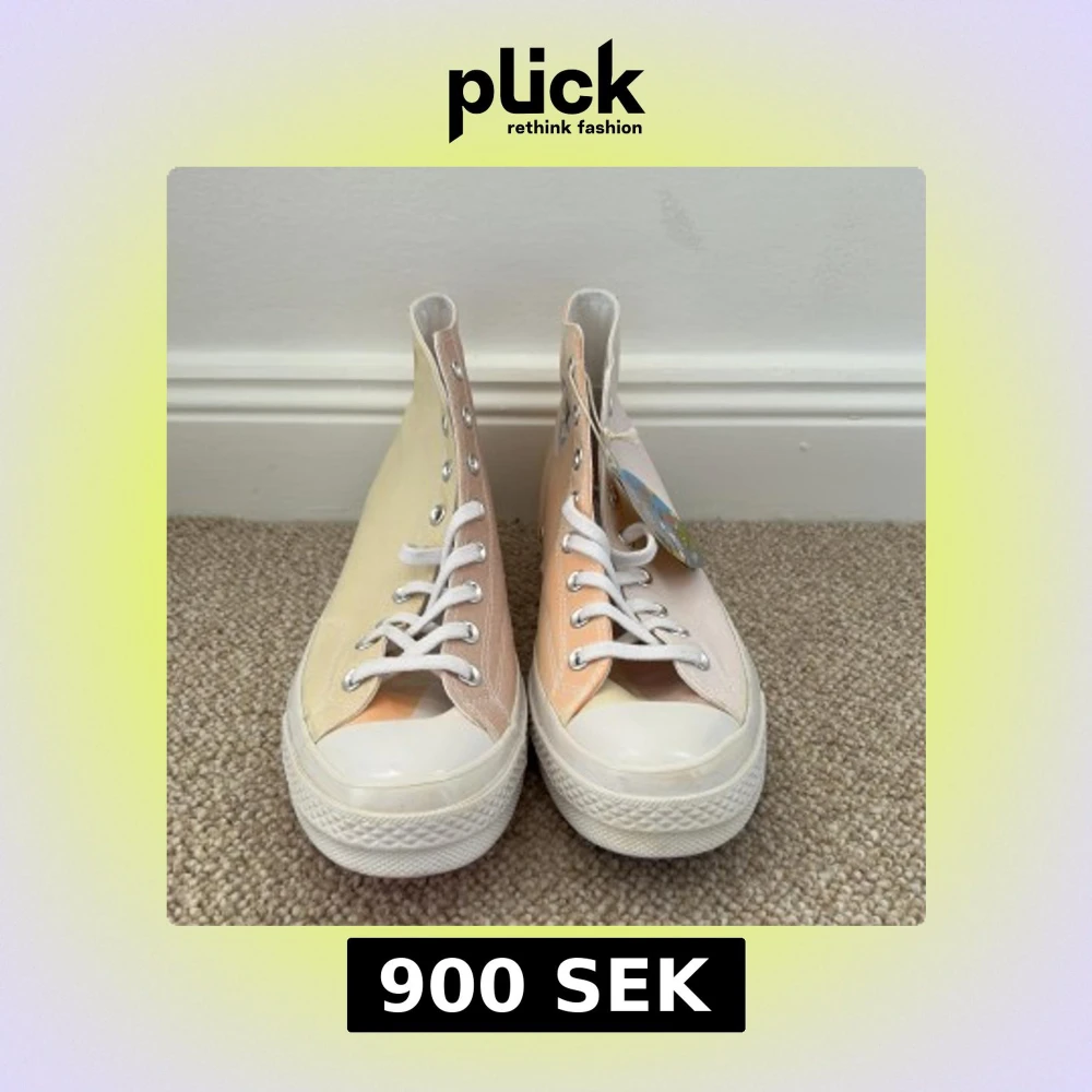 Säljer ett par Converse Chuck Taylor All Star high-top sneakers som skiftar färg. Skorna har en unik design med pastellfärger i beige, rosa och vitt, samt vit sula och tå. Klassisk logga på sidan och färgglad sula undertill. Dessa unika skor är vita från början men när de är utsatta i solen i några sekunder byter färgen
