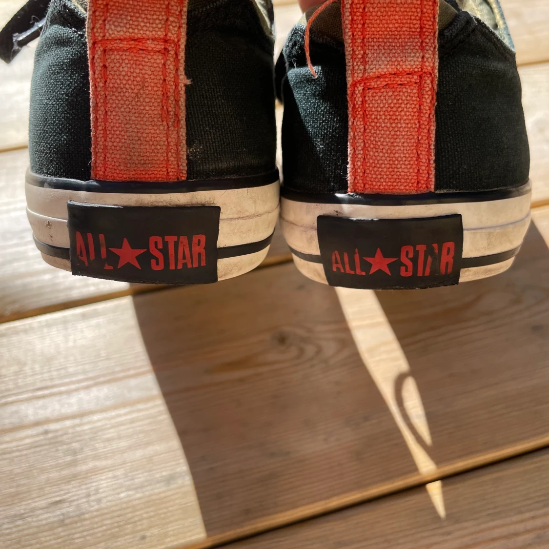 Fina svarta låga Converse i fint skick med kamouflage färgat foder och röda detaljer. Som nya kostar de ungefär 700kr, men säljs till 250kr. Betala gärna med Swish. Finns att hämta utanför Lomma, men kan även fraktas och då står jag för frakten