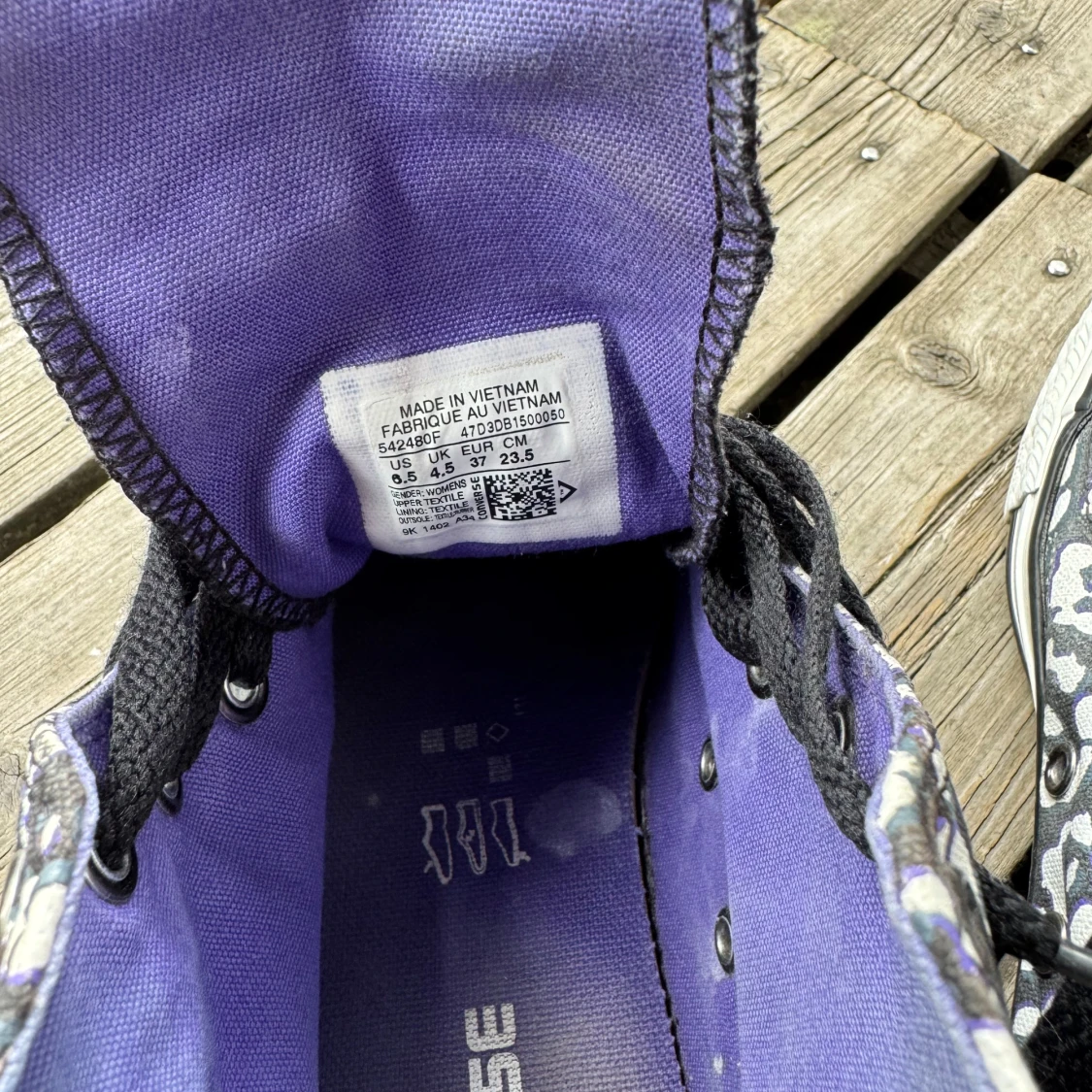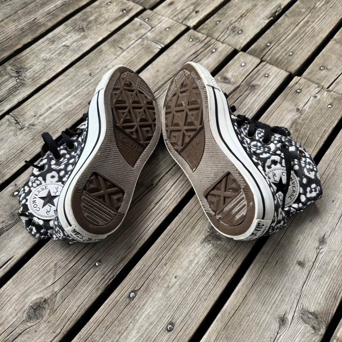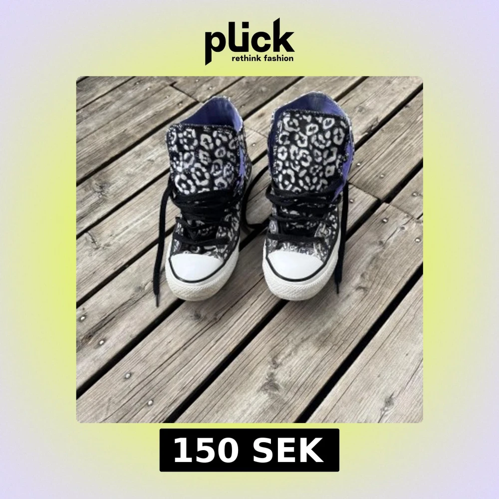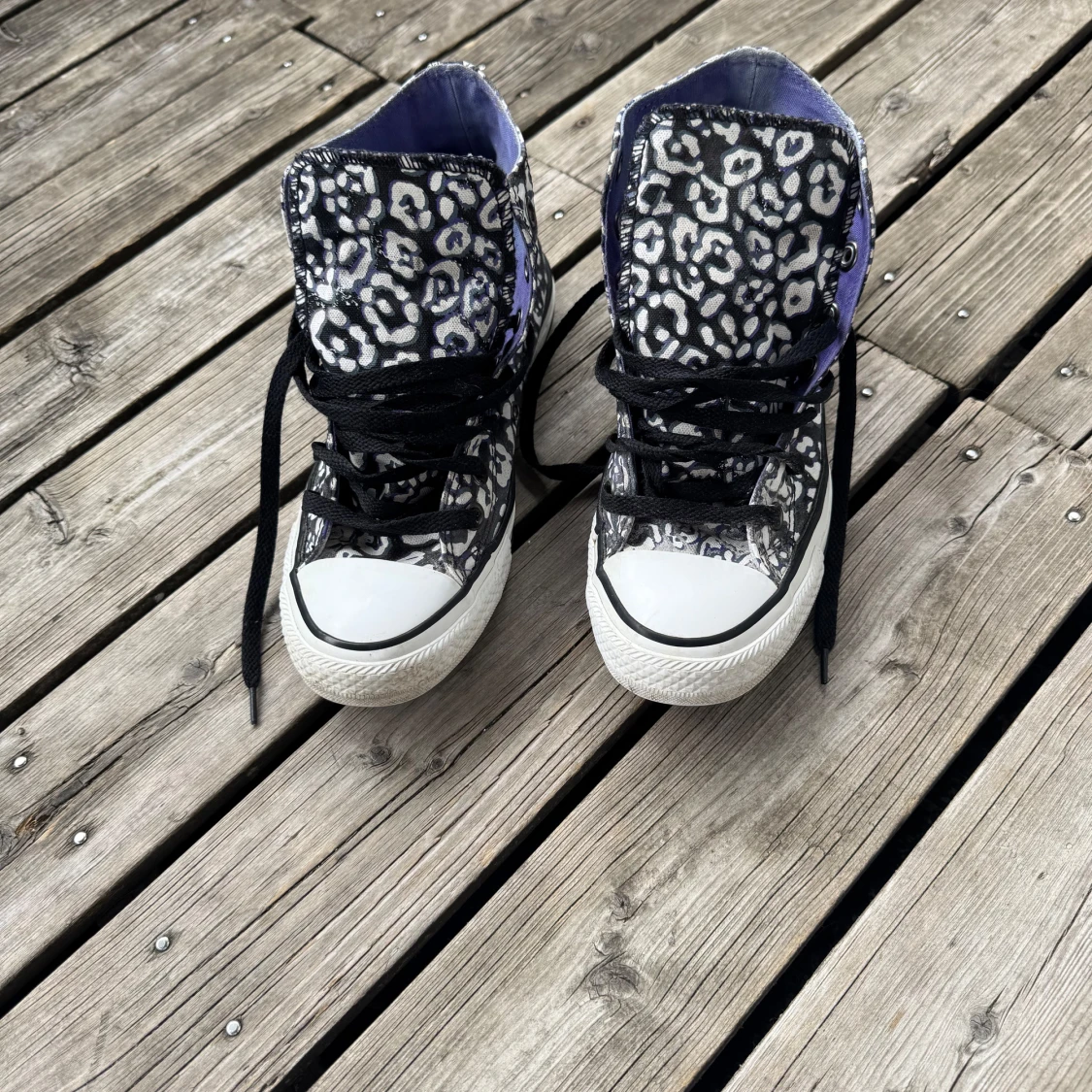 Säljer ett par Converse All Star high-top sneakers i storlek 37 med svart och vit leopardmönster. Skorna har lila textilfoder, svarta snören och klassisk rund tå. Yttermaterialet är bomullstextil och sulan är vit med svart rand. Perfekt för dig som vill sticka ut med coola detaljer.