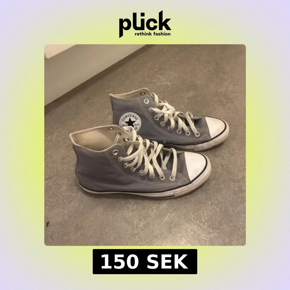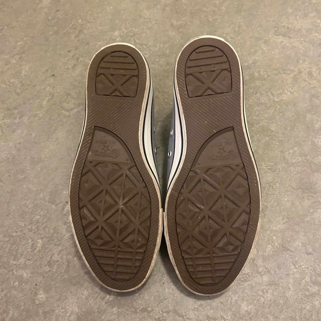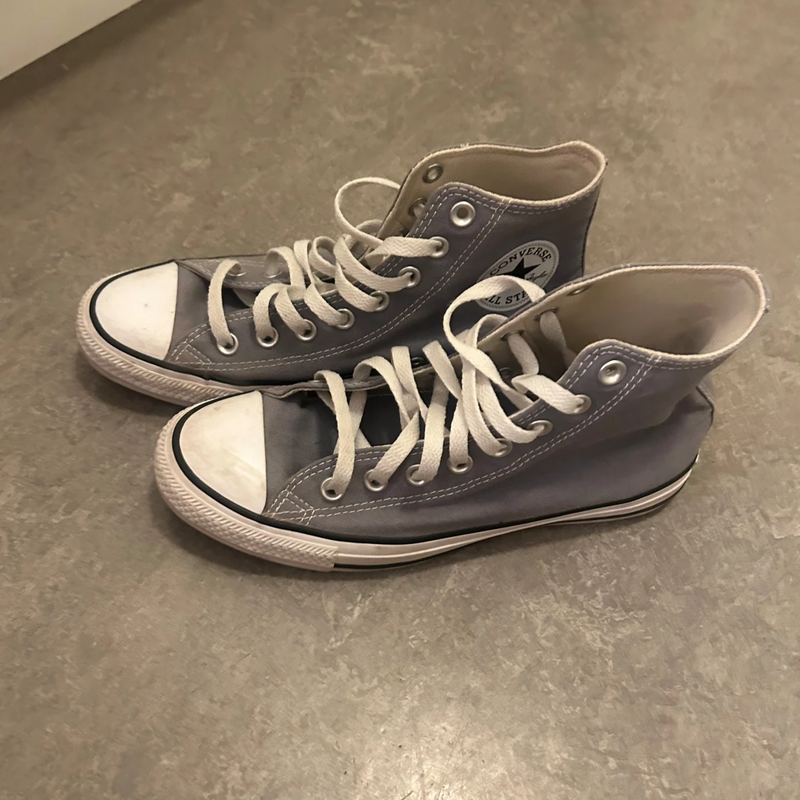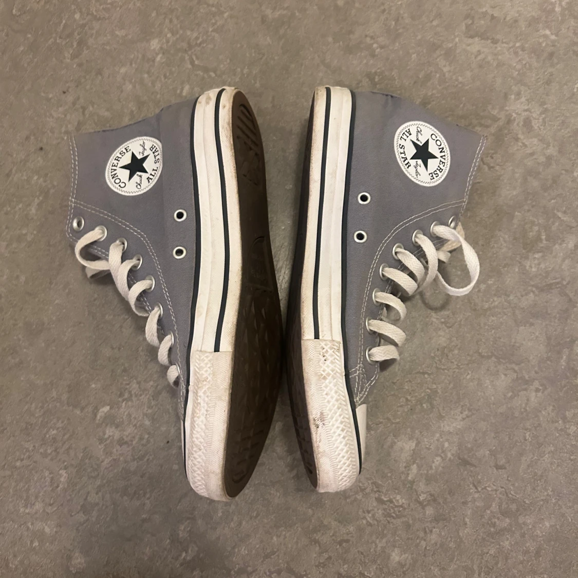 Säljer ett par klassiska grå höga Converse sneakers med vit sula och snörning. Skorna har den ikoniska Converse-loggan på sidan och är perfekta för en avslappnad stil.