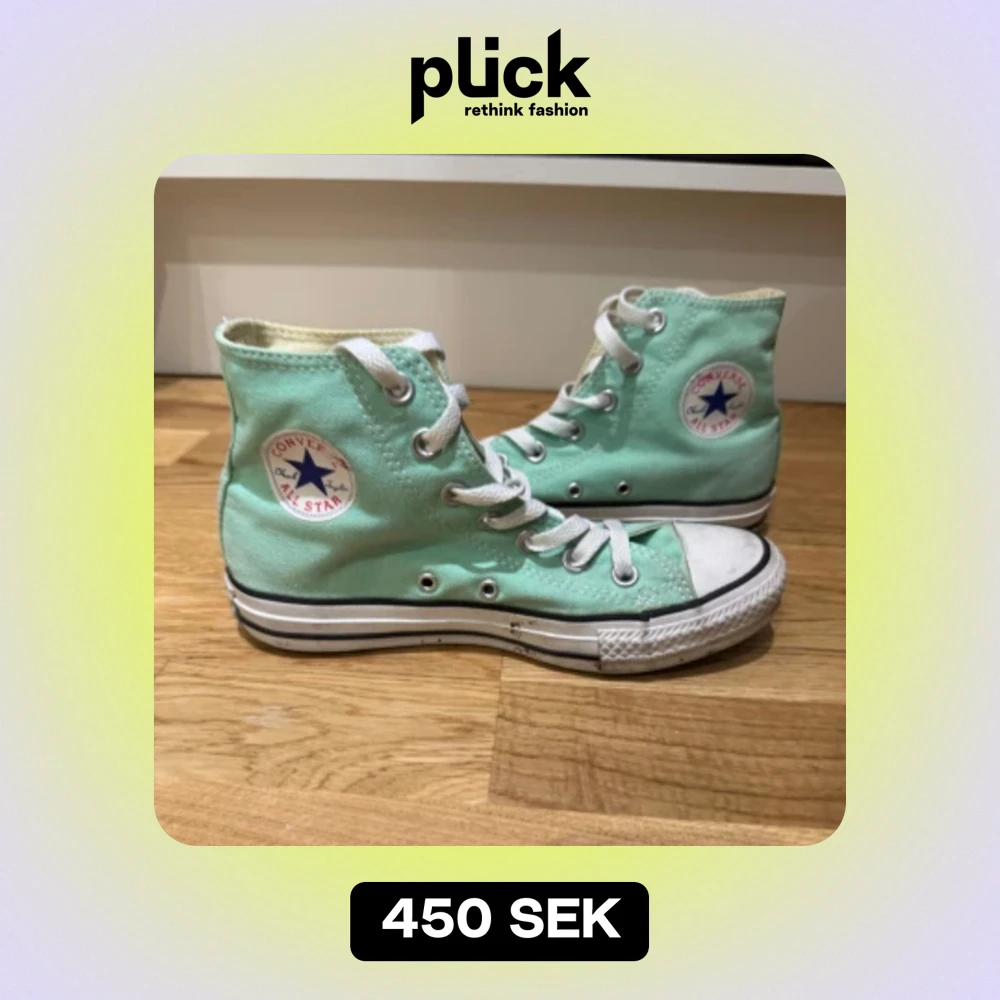 Helt nya Converse high top. Köpt för 750 kr (Nypris). Testat använda dom men storleken var för liten. Så sulorna är smutsiga men inte slitna. Väldigt fin mintgrön färg. Storlek 36. För frågor eller fler bilder skicka iväg ett meddelande