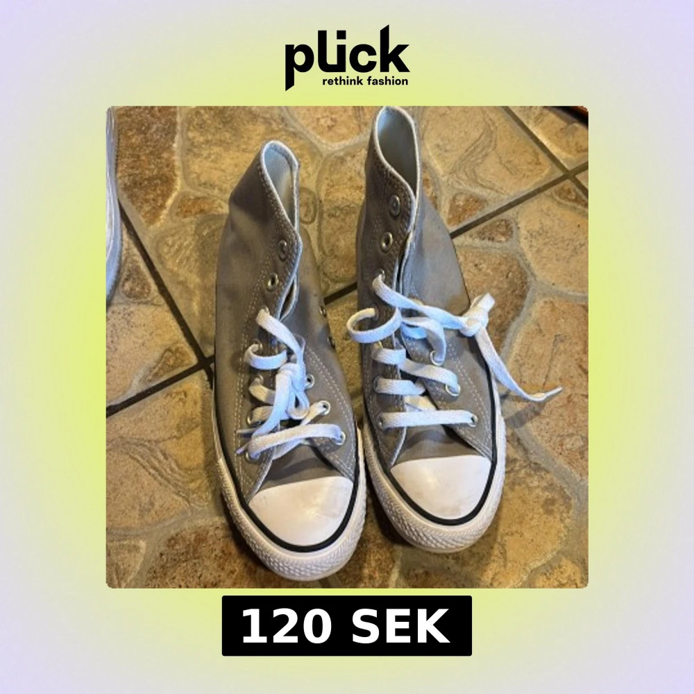 Säljer ett par klassiska grå höga Converse All Star med vit tå och vita snören. Skorna har den ikoniska loggan på sidan och svart rand runt sulan. Perfekta för dig som gillar tidlös streetstil.