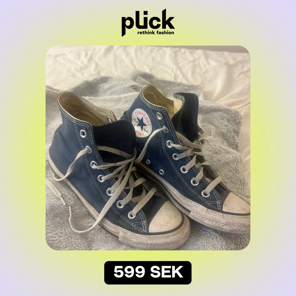 Säljer ett par klassiska blå Converse All Star sneakers i bra skick. De har den ikoniska vita sulan och snörning, med det välkända märket på sidan. Perfekta för en avslappnad stil och funkar året runt. Lite slitna men fortfarande snygga och bekväma!