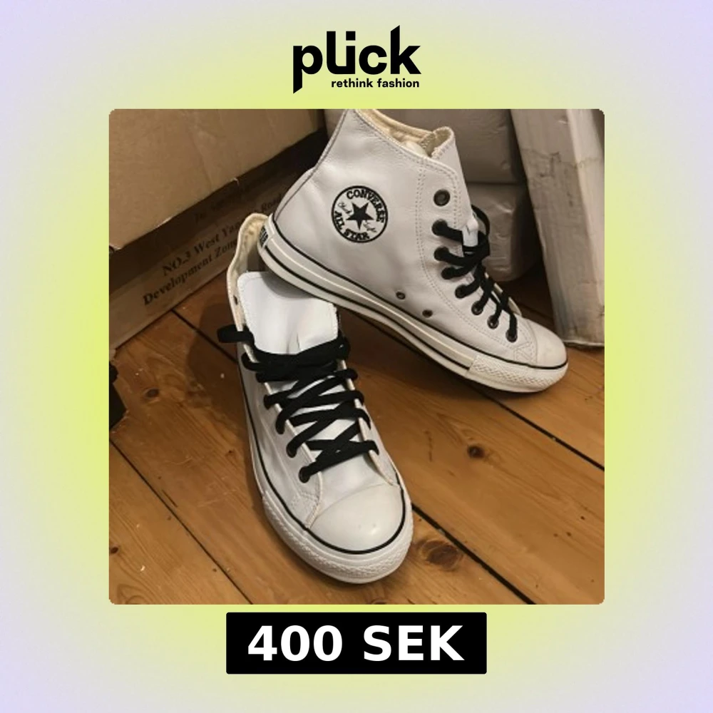 Säljer ett par klassiska vita Converse All Star sneakers med högt skaft och svarta snören. Skorna har den ikoniska loggan på sidan och en slitstark gummisula. Perfekta för en avslappnad stil. Köpt på convers butik i Thailand för många år sedan.
