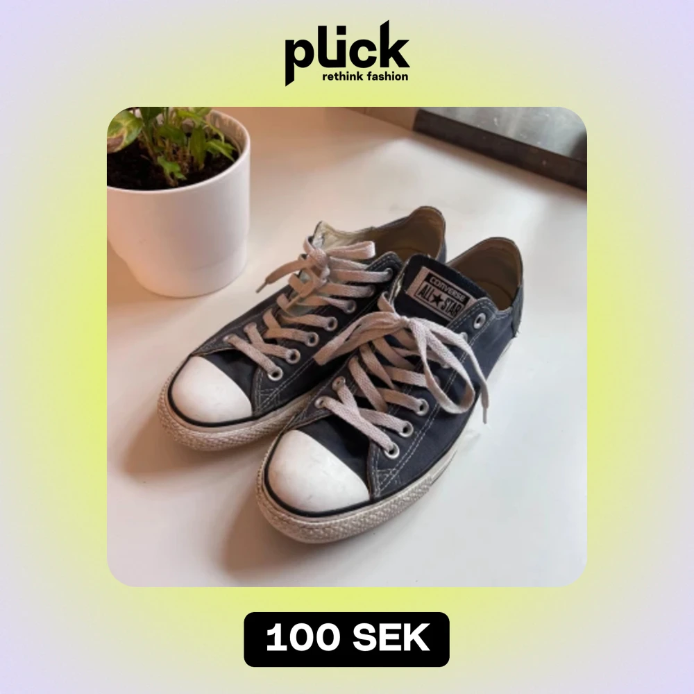 Marinblå Converse i använt skick. Köpta i andra hand, tidigare ägaren sa att de är lagade hos en skomakare (se andra bilden). Skorna är lite smutsiga, går att få bort. Normal i storlek