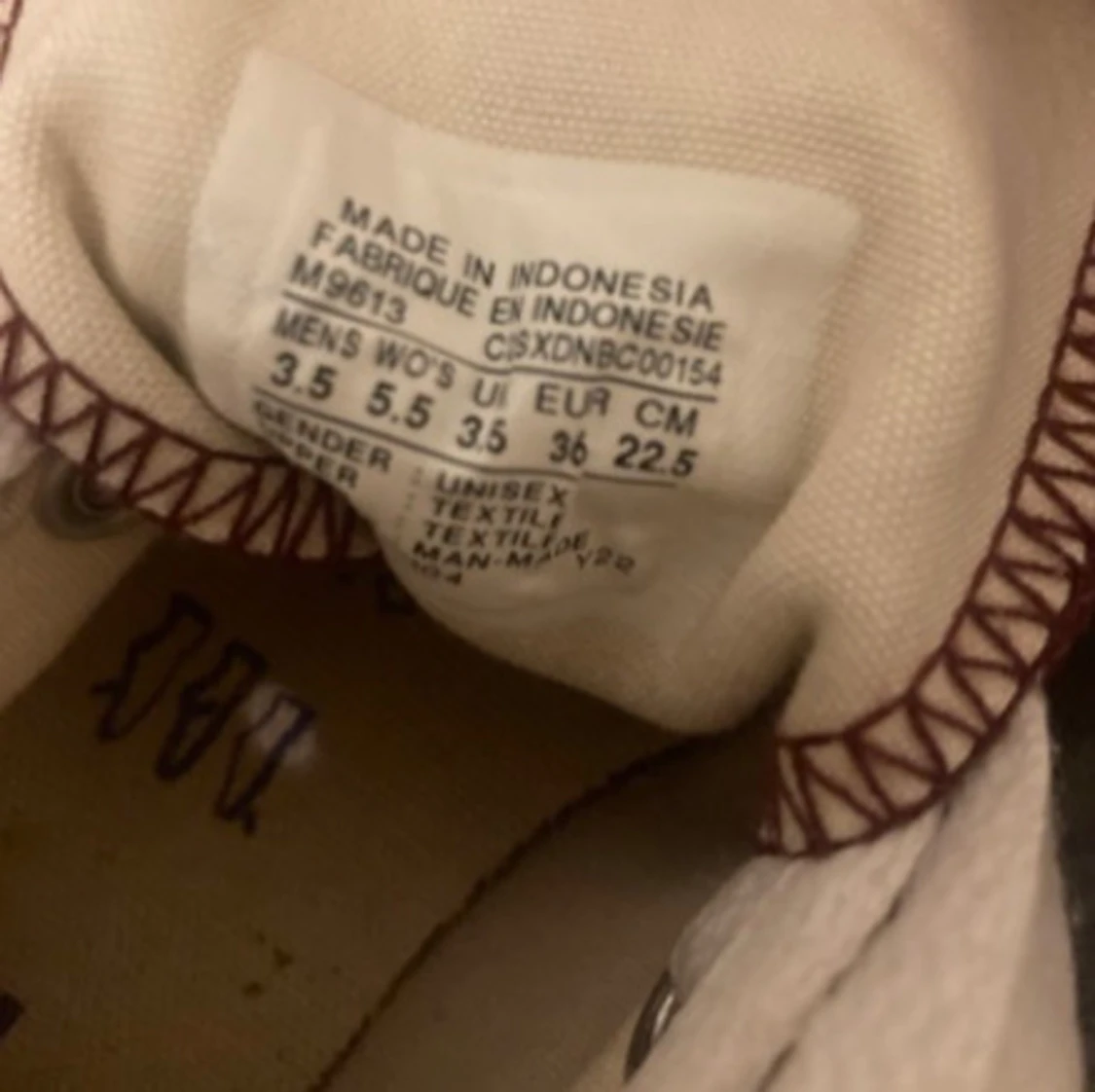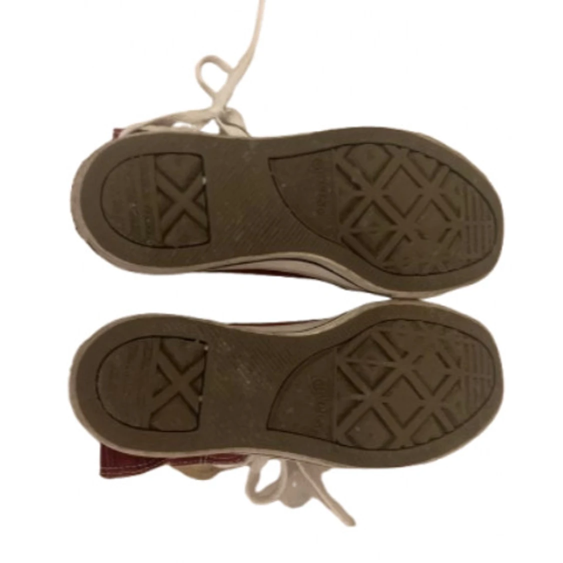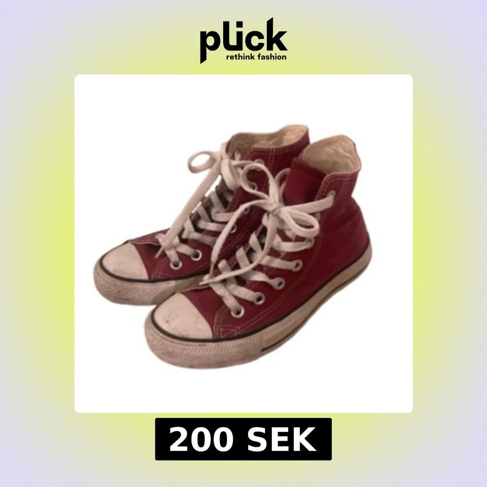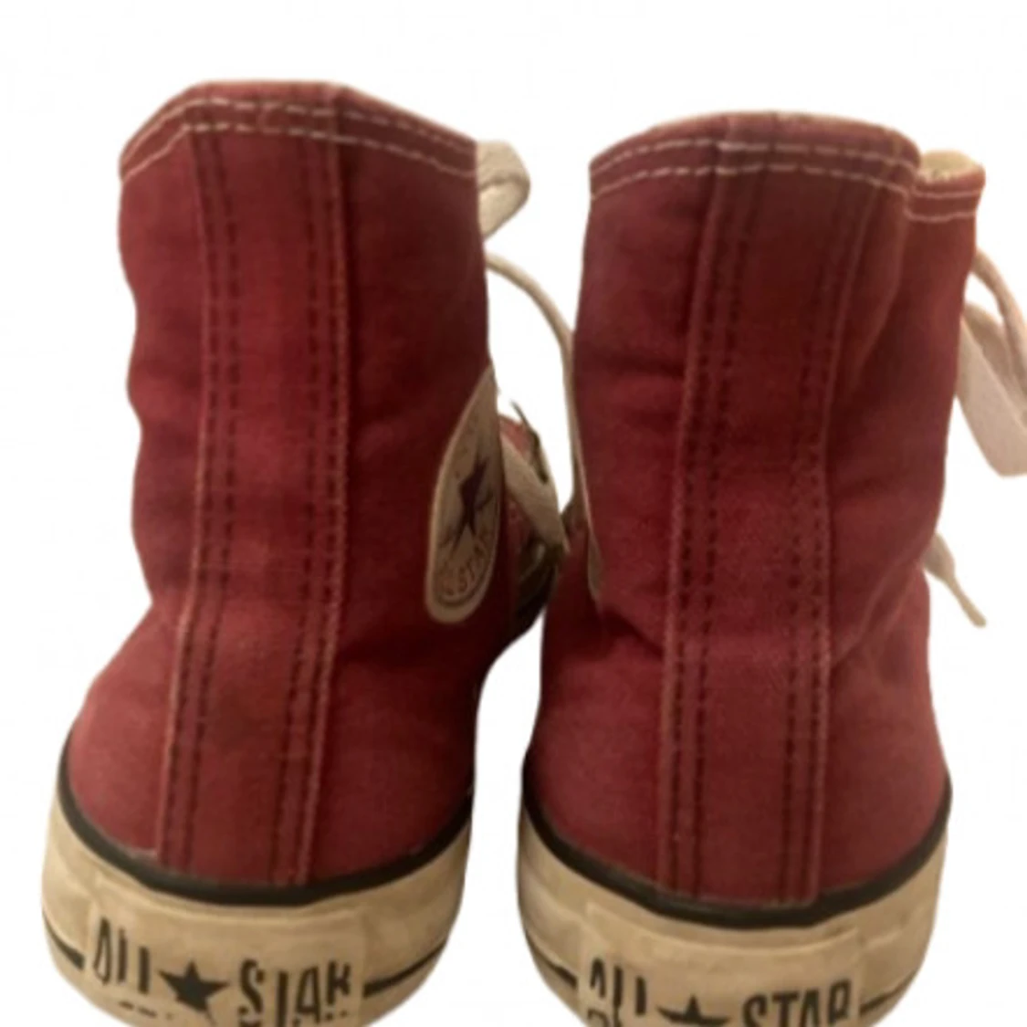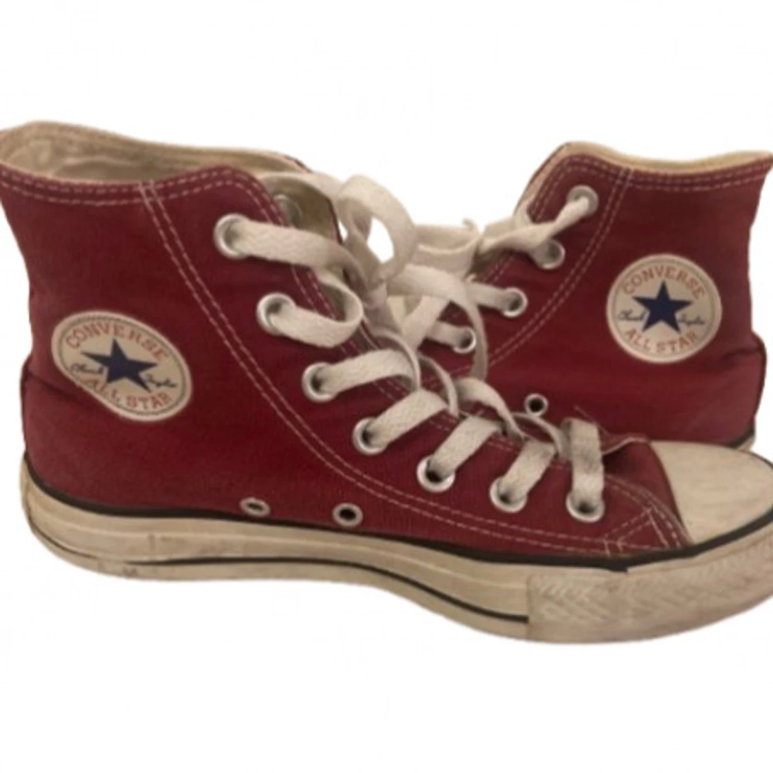 Klassiska mörk röda Converse All Star high-top sneakers med vita snören och gummisula. Skorna är i storlek 36, använda fåtal gånger. Sulan är smutsig annars är de i bra skick! Pris kan diskuteras!