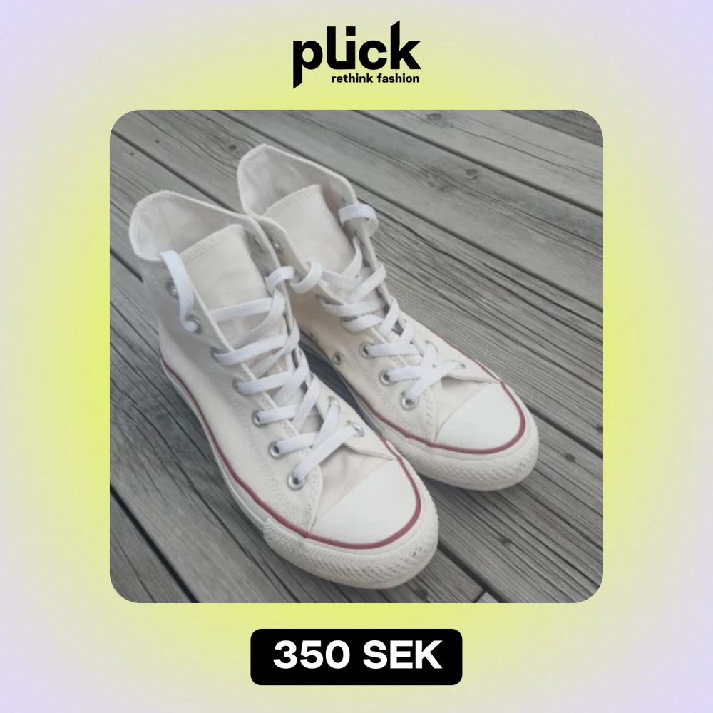 Ett par vita vanliga converse. Dom är inte kritvita utan har en mer gräddig färg. Storlek 37.5 men passar mig som brukar ha 38. I princip oanvända så väldigt fint skick.