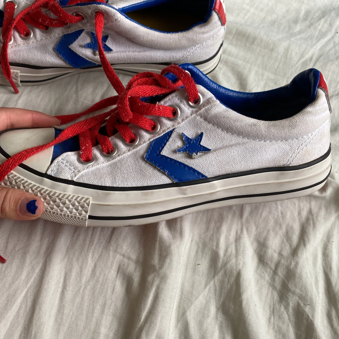 Låga vita converse med röda skosnören och blåa detaljer. De har gula sulor där converse märket fortfarande är kvar då jag använt dem få gånger. Kanterna på insidan är mörkblå.