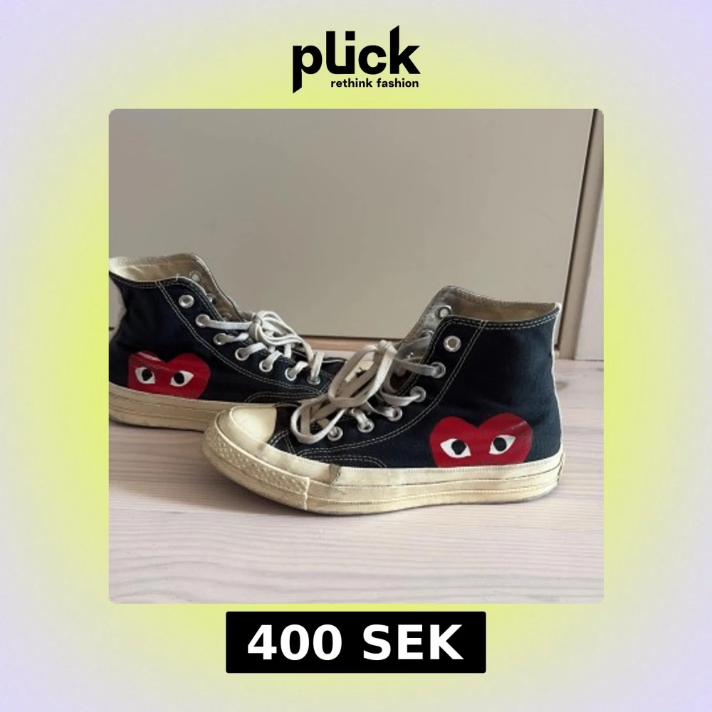 Svarta Converse Chuck Taylor All Star high tops i samarbete med Comme des Garçons Play. Skorna har det ikoniska röda hjärtmotivet med ögon på sidan, vita snören och gummisula.