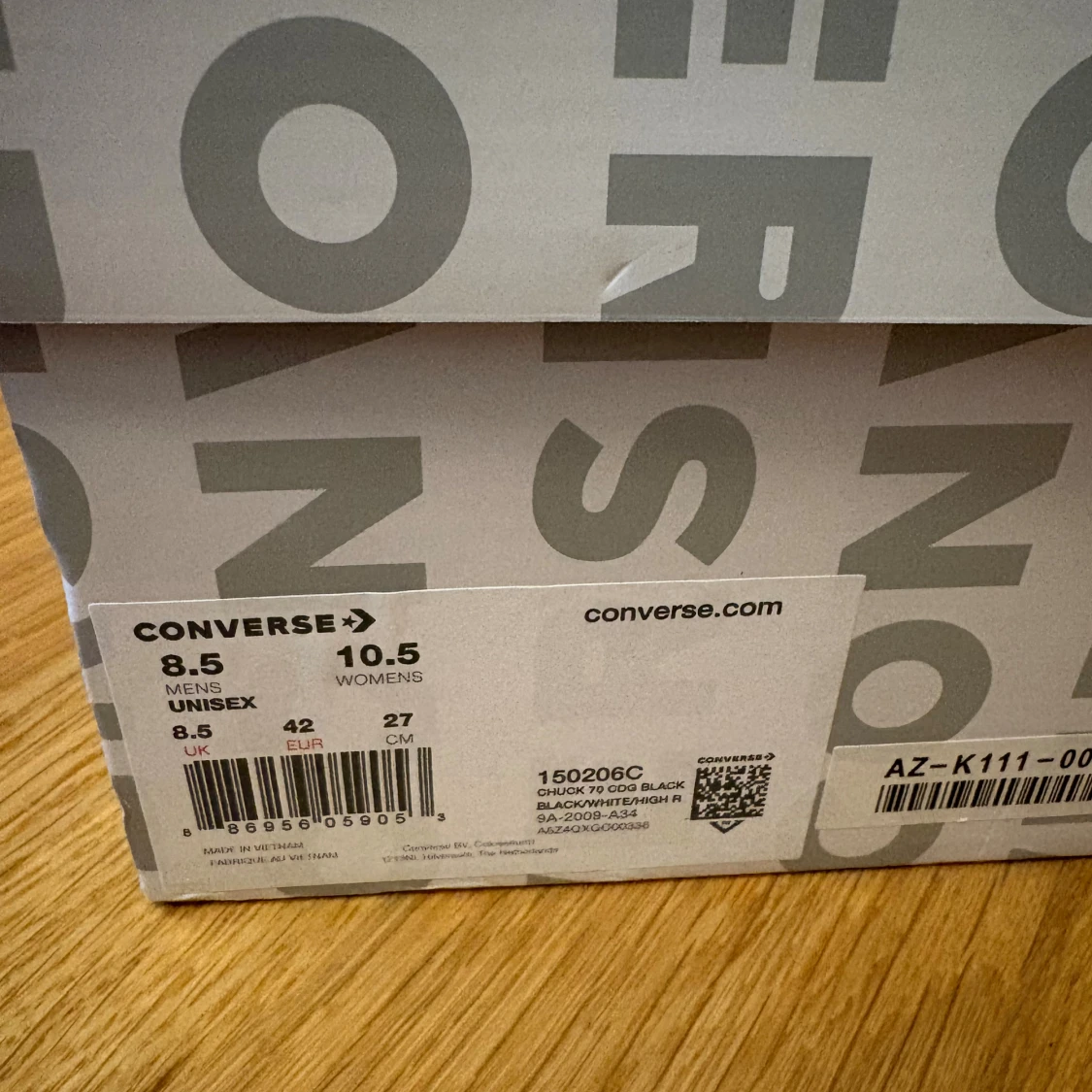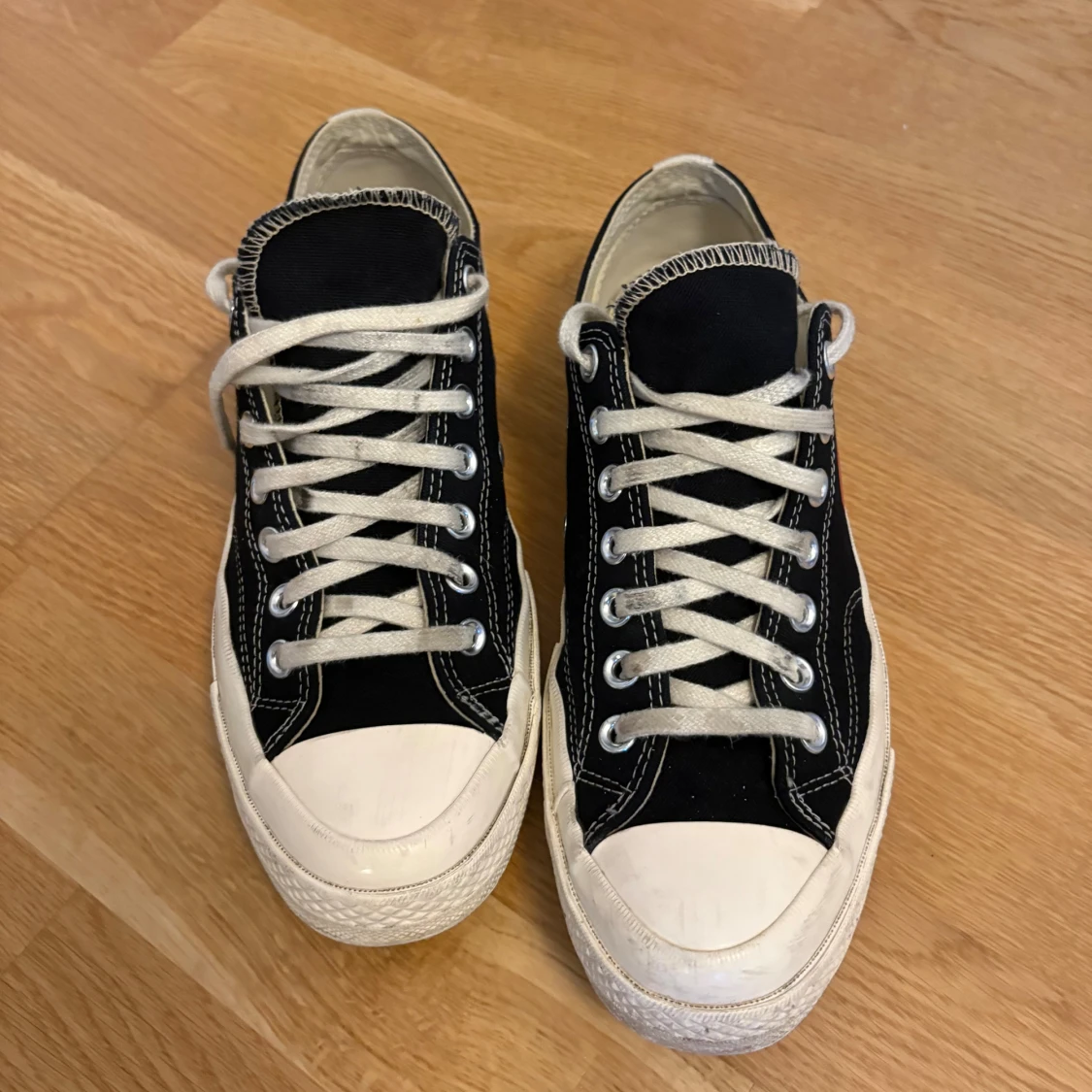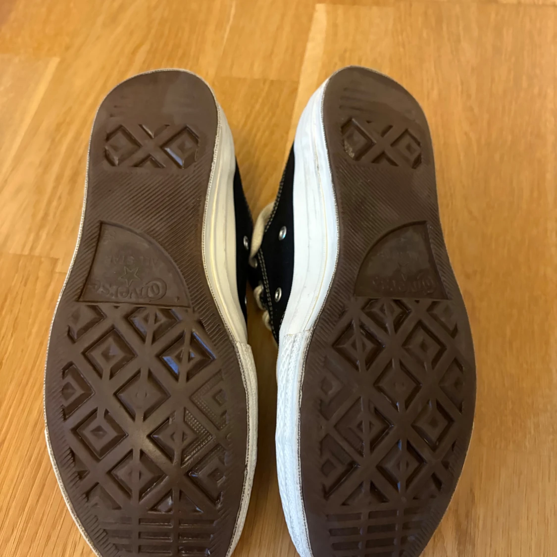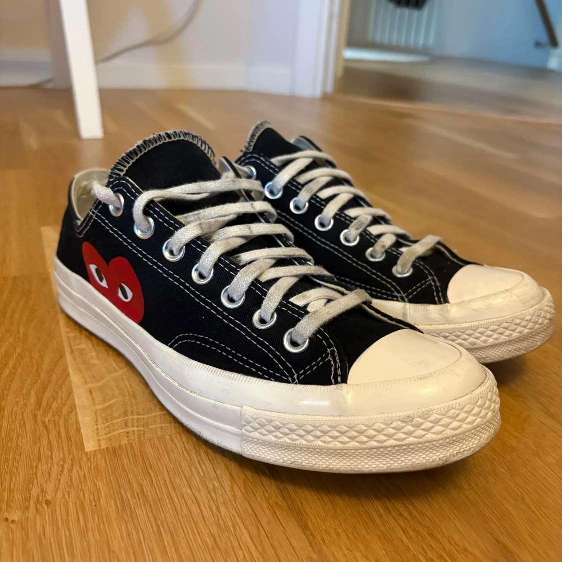 Säljer ett par Converse x Comme des Garçons Play sneakers i svart canvas med vit sula och snörning. Skorna har det ikoniska röda hjärta-trycket på sidan och klassisk rund tå. Perfekta för dig som vill ha en stilren look. Tveka inte på att höra av er vid frågor eller funderingar! Priset kan diskuteras!