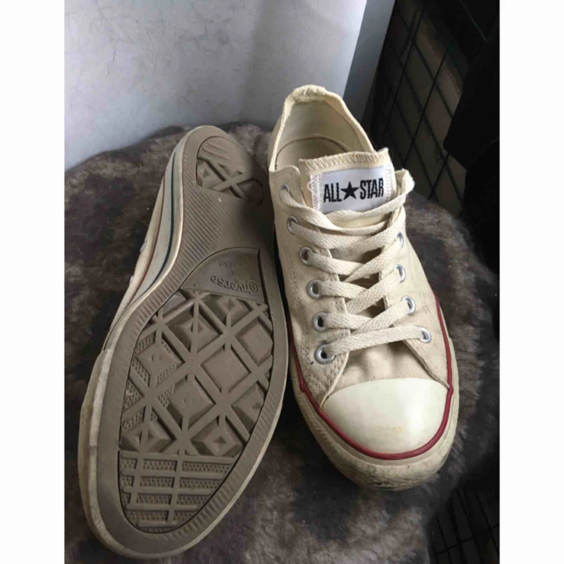 Offwhite converse i bra skick. Använda men har mycket kvar att ge. Katt finns i hem, köpare betalar frakt om de ska skickas. Kan annars mötas upp i Göteborg/Partille.