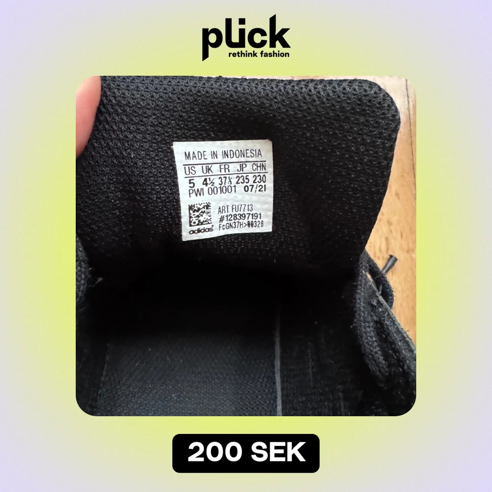 Säljer ett par klassiska svarta Adidas sneakers i bra skick. De har den ikoniska snäckformade tån och tre ränder på sidan. Perfekta för vardagsbruk och ger en stilren look. Tillverkade i syntetmaterial med snörning för bästa passform.