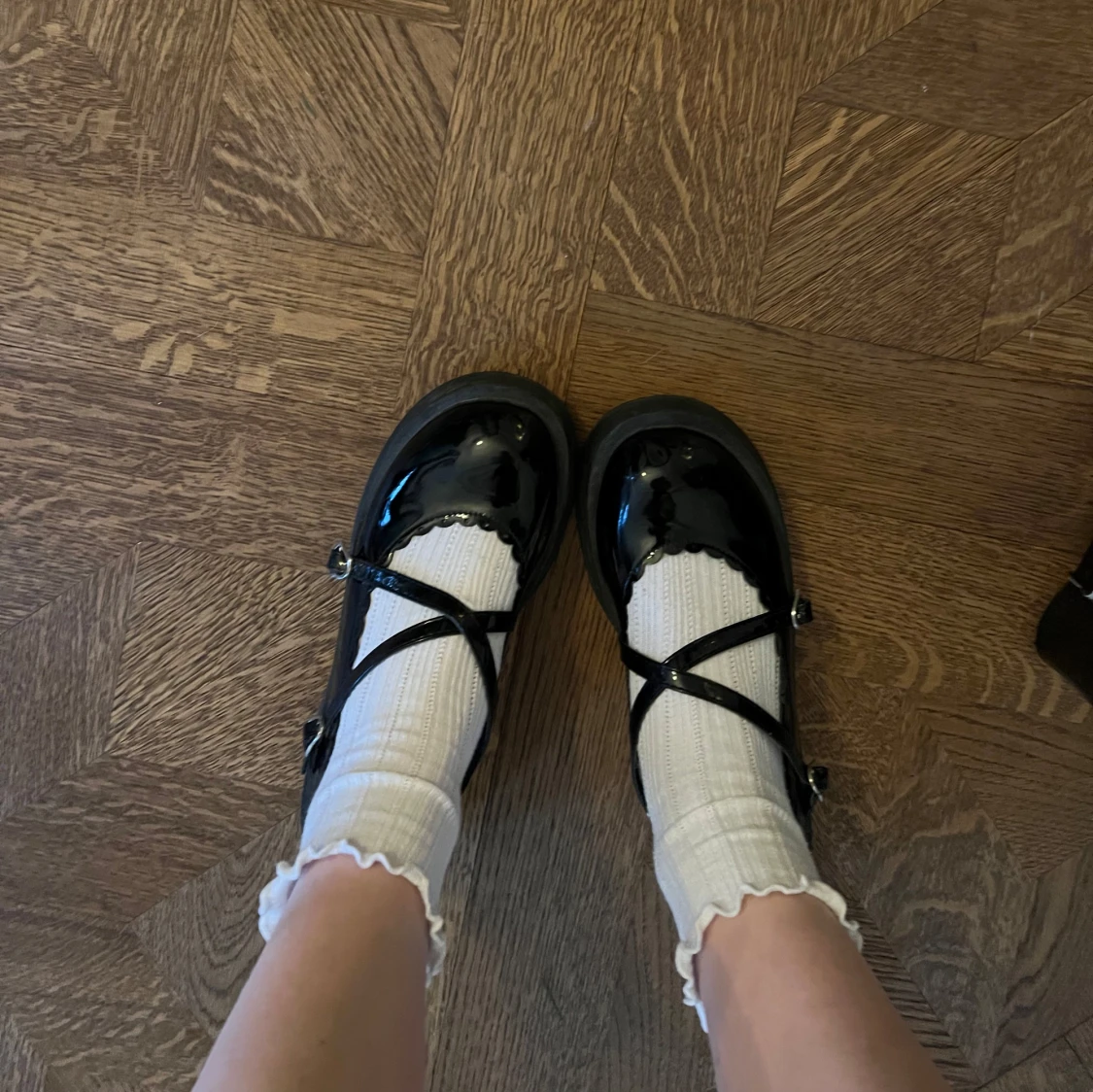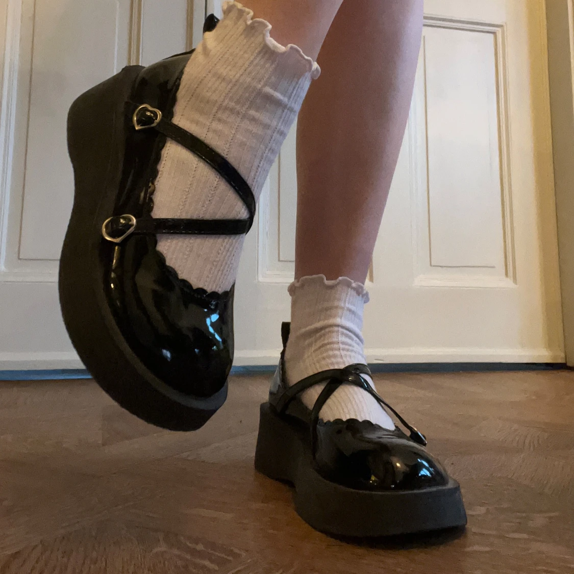 Såå söta Mary Jane-skor med platåsula. Skorna har dubbla remmar med spännen med hjärtan 🖤Hur gulliga som helst med strumpor. Köpta från Plick. Se sista bild för lite slitage på insidan, synns verkligen inte när man har dem på