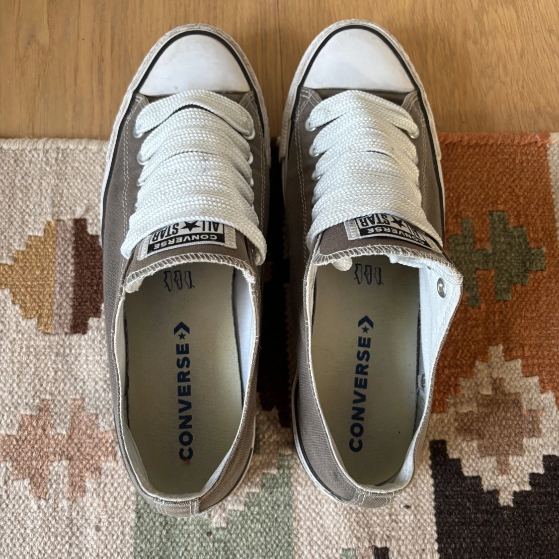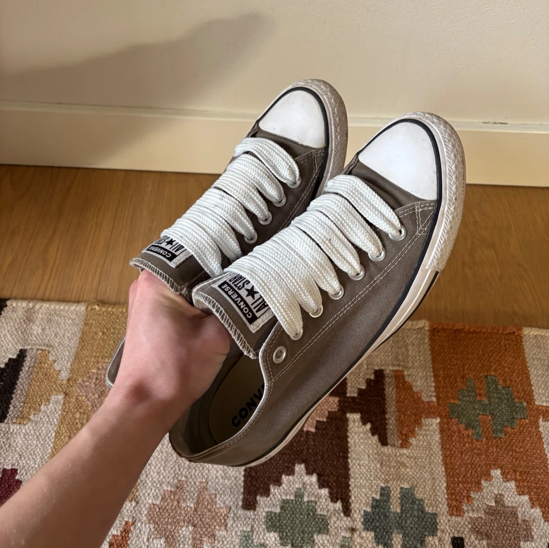 Tja! Säljer nu ett par riktigt sköna custom Converse skor i storlek 43. Satt dit tjockare snören för en mer unik look. Lite smutsiga kanske men annars i riktigt fint skick! Hör av dig vid frågor eller liknande✌️