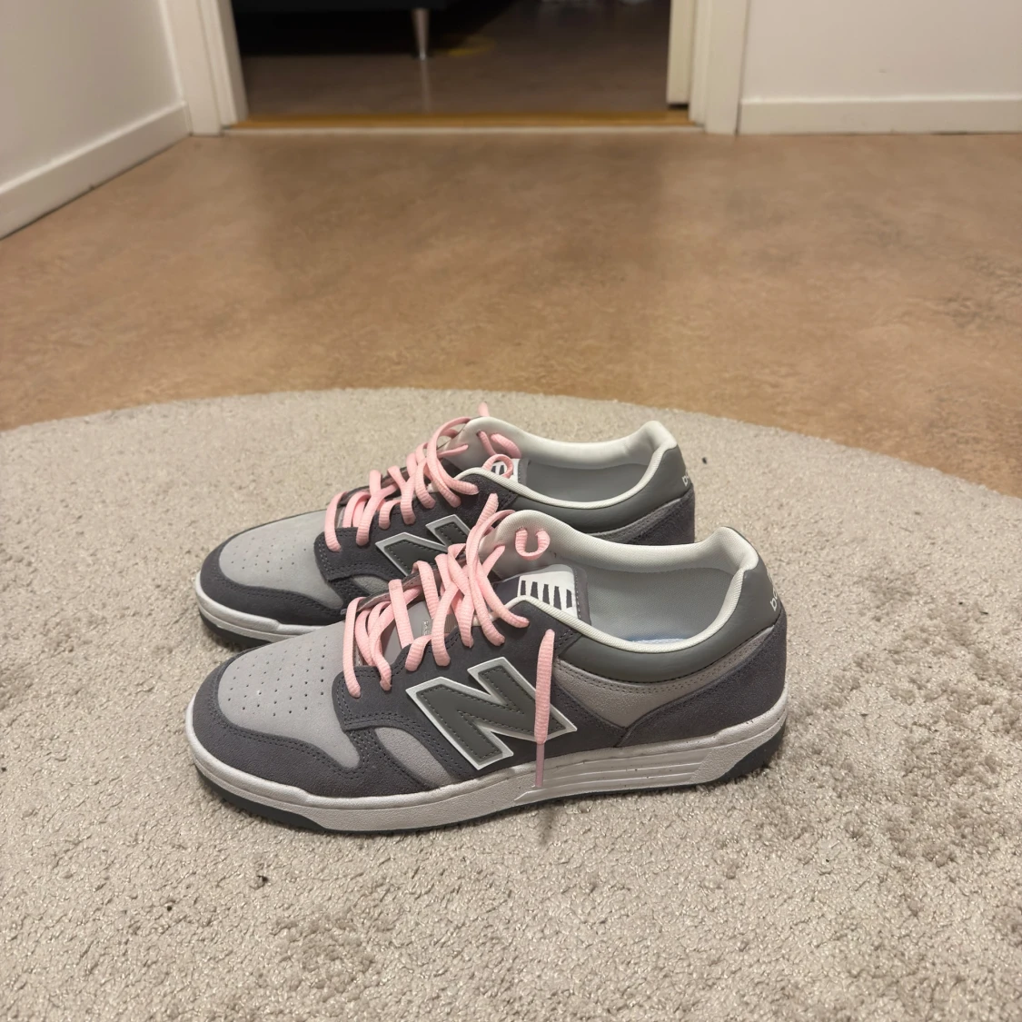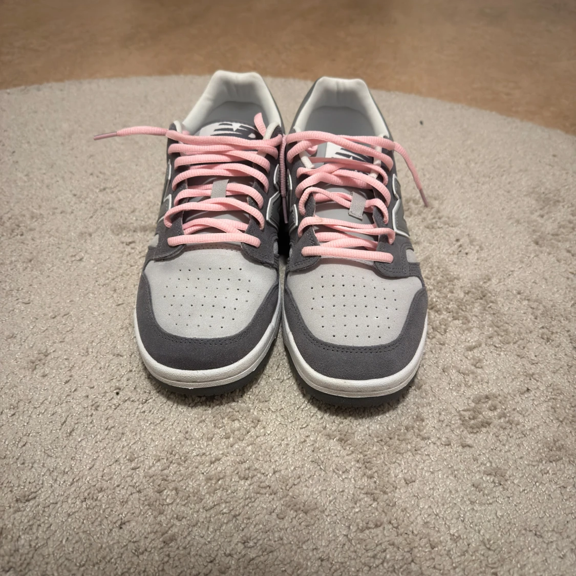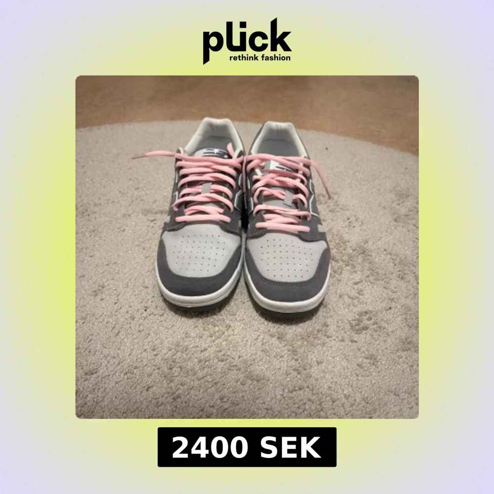 Säljer ett par Custom New Balance BB480LEC sneakers i grått med ljusgrå mesh och mockadetaljer. De har rosa snören som ger en snygg kontrast och klassisk N-logga på sidan. Platt sula och rund tå för skön passform. Perfekt för dig som gillar stilrena och sportiga skor.