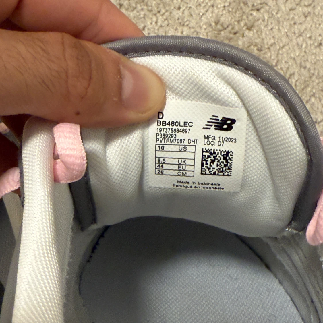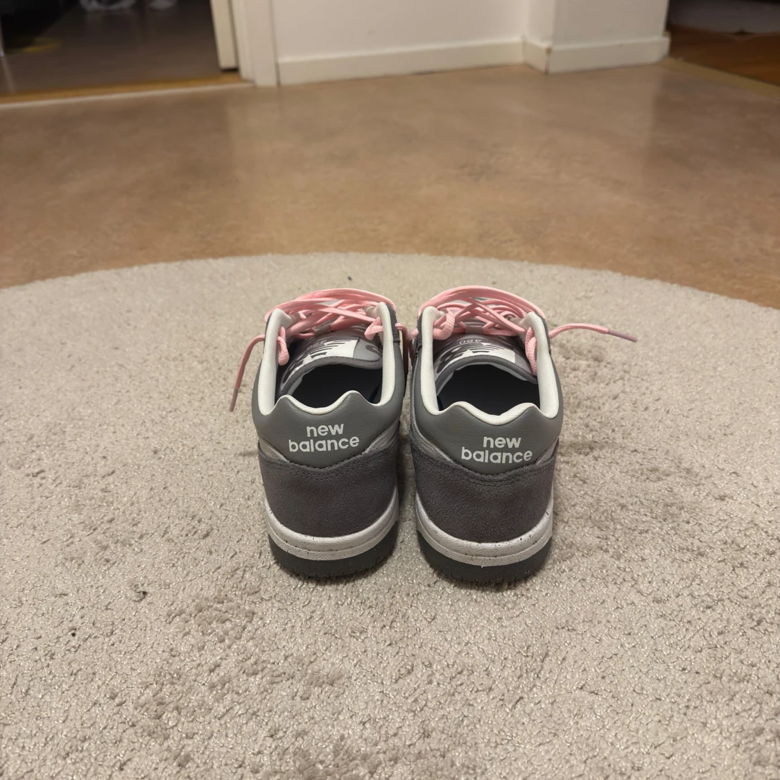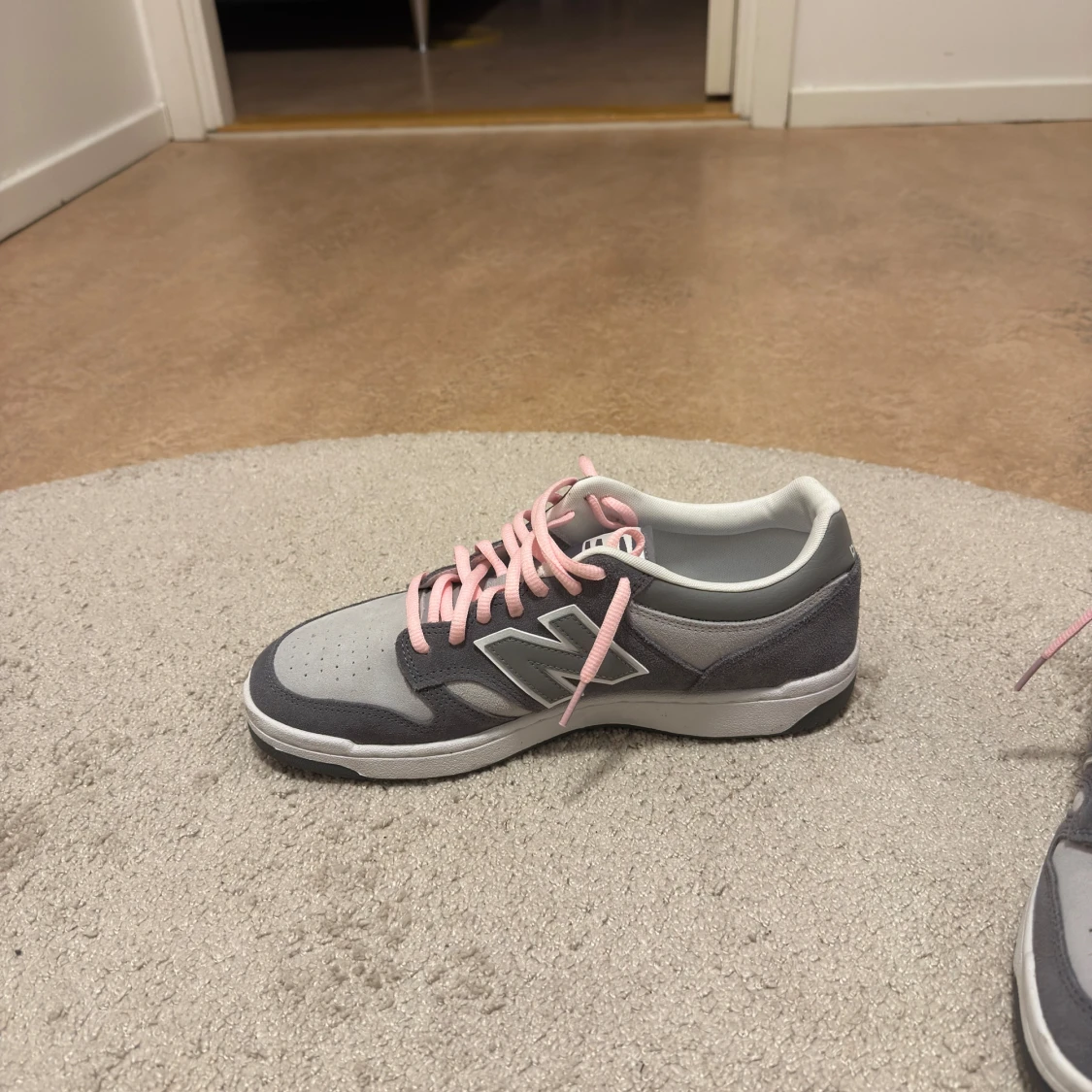 Säljer ett par Custom New Balance BB480LEC sneakers i grått med ljusgrå mesh och mockadetaljer. De har rosa snören som ger en snygg kontrast och klassisk N-logga på sidan. Platt sula och rund tå för skön passform. Perfekt för dig som gillar stilrena och sportiga skor.