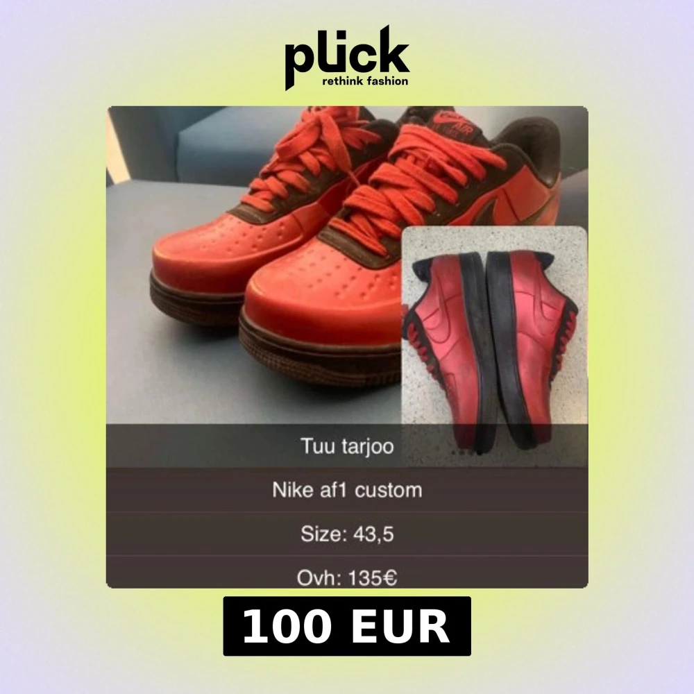 Unika custom Nike Air Force 1 sneakers i storlek 43,5. Skorna har en fet röd ovandel med svarta detaljer och sula, samt röda snören. Klassisk låg siluett med rund tå och platt sula. Perfekt för dig som vill sticka ut med en personlig stil.