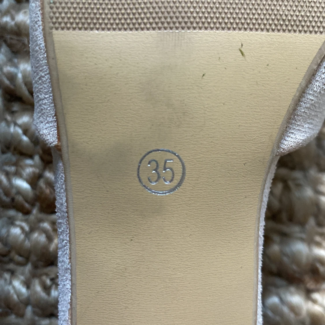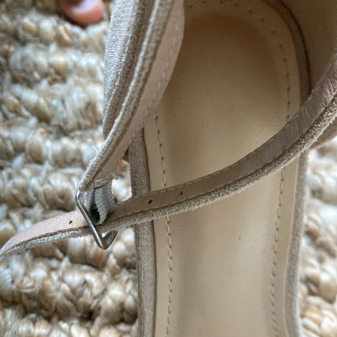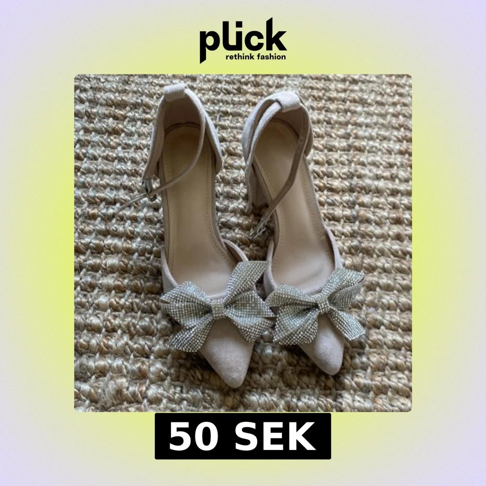 Snygga beige klackskor med spetsig tå och glittriga rosetter framtill. Skorna har en bekväm blockklack och justerbara remmar runt ankeln. Perfekta för att lägga till lite glamour till din outfit.