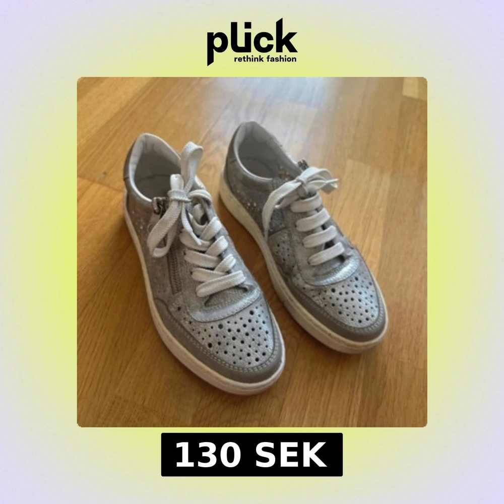 Säljer ett par silvriga sneakers från Rieker med vita snören och perforerat mönster på ovandelen. Skorna har dragkedja på sidan och vit sula. Perfekta för dig som vill ha något snyggt och bekvämt till vardags.