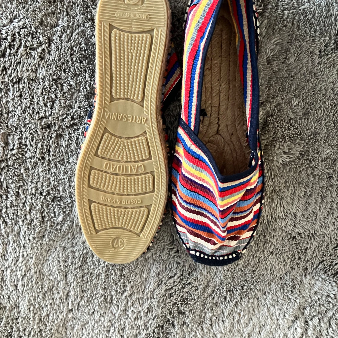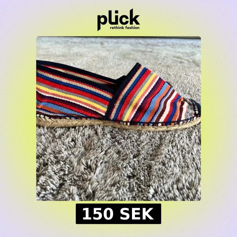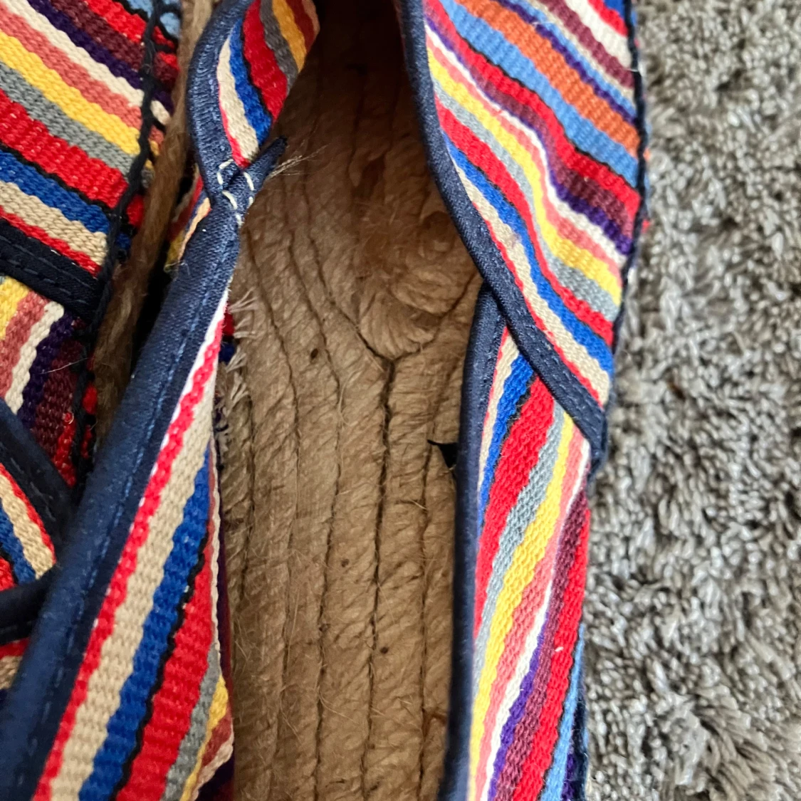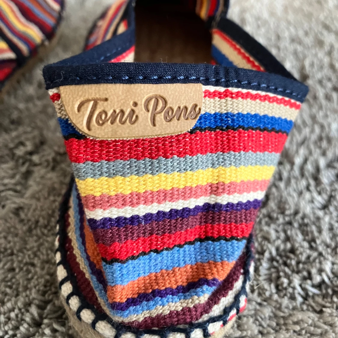 Säljer ett par espadrillos från Toni Pons med färgglada ränder i rött, blått, gult och orange. Skorna har ovandel i textil och sula i flätad jute och yttersula i gummi. Perfekta för varma dagar och ger en bohemisk touch till outfiten.