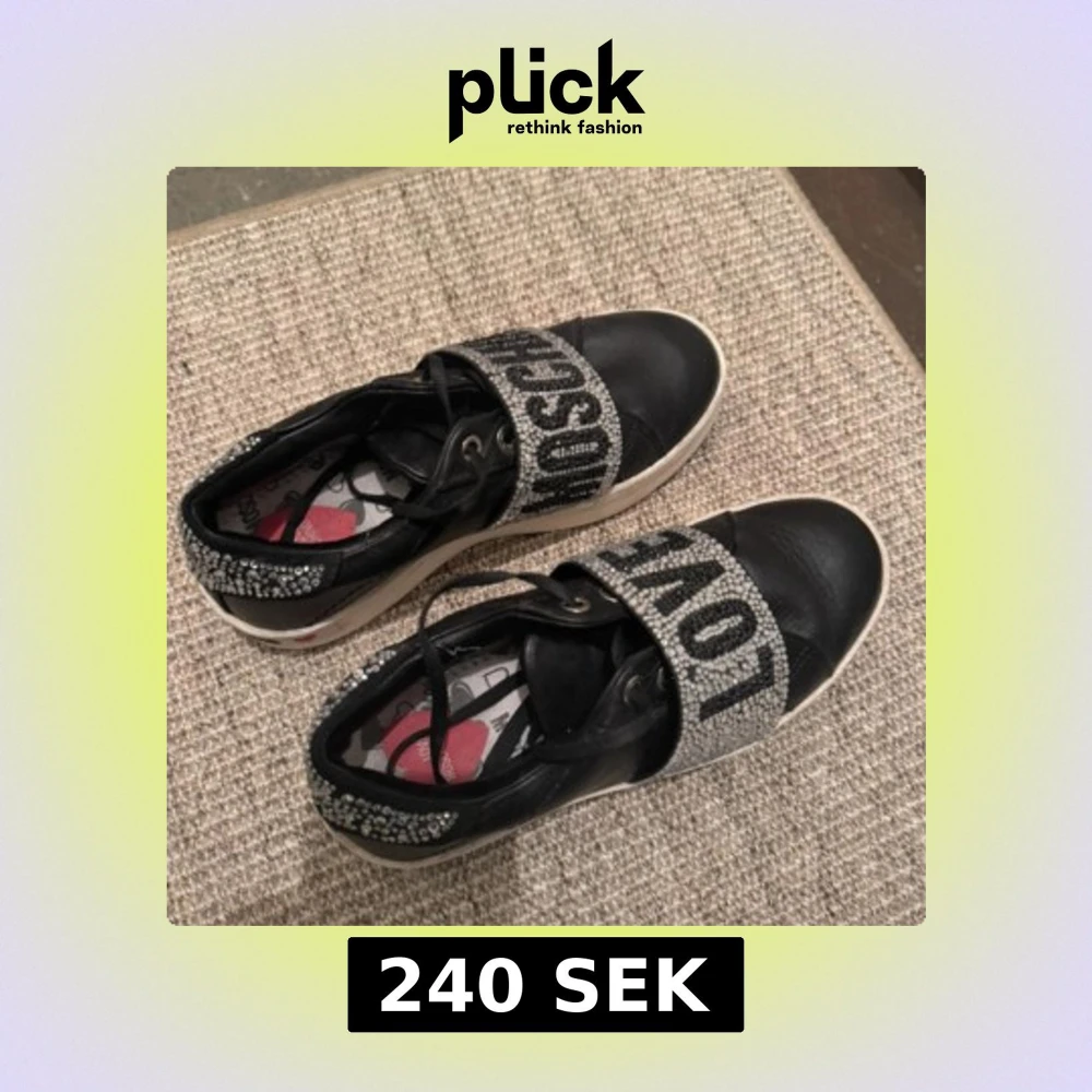 Snygga svarta sneakers från Love Moschino med breda band över foten med texten 'LOVE' och 'MOSCHINO' i silver. Dekorerade med glittrande strassdetaljer på hälen och bandet. Tjock vit sula med logga och hjärta på sidan.