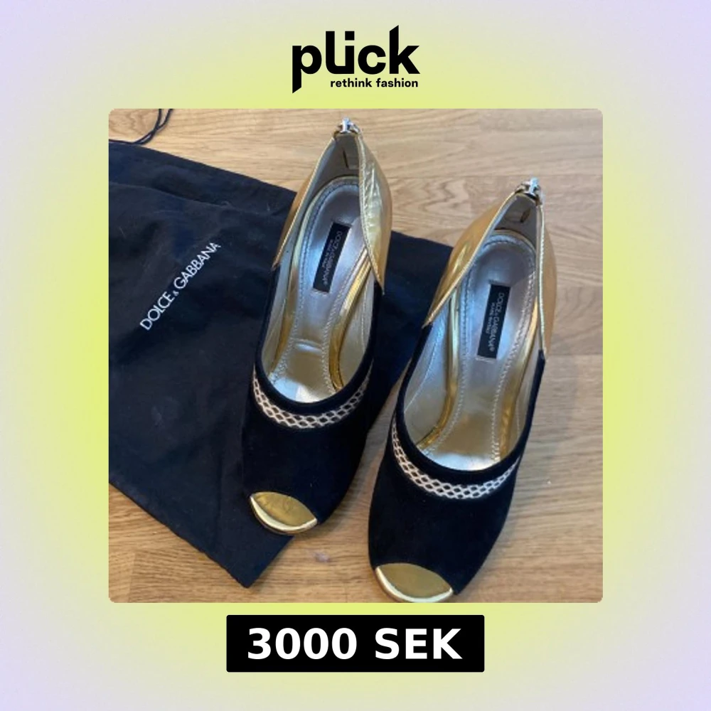 Eleganta klackskor från Dolce & Gabbana i svart mocka med guldiga detaljer. Skorna är i svart mocka, och läder med en smal klack. Perfekta för en glamorös kväll..