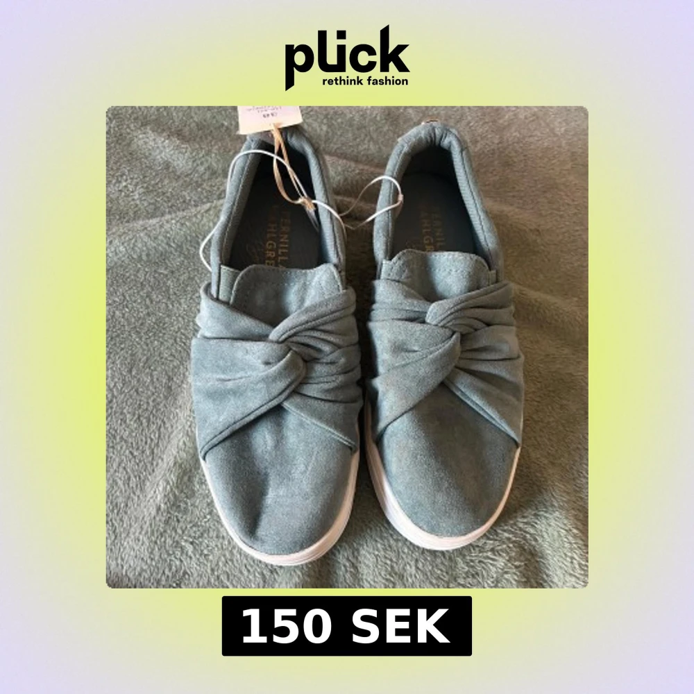Snygga gröna slip-on sneakers från Pernilla Wahlgren med twistad detalj framtill. Skorna har vit platt sula och är tillverkade i mocka. Perfekta för dig som vill ha både stil och komfort i vardagen.