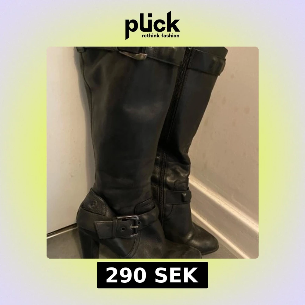Säljer ett par svarta höga stövlar med dekorativa spännen och dragkedja på sidan. Skorna har klack och är tillverkade i äkta skinn. Knappt använda de är i storlek 36