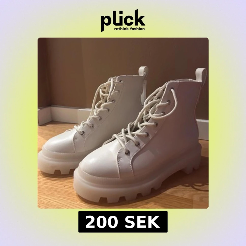 Snygga vita boots från H&M Divided i veganskt material. De har en rejäl sula och snörning framtill. Skorna är i storlek 38 med prislappen kvar då de aldrig är använda.