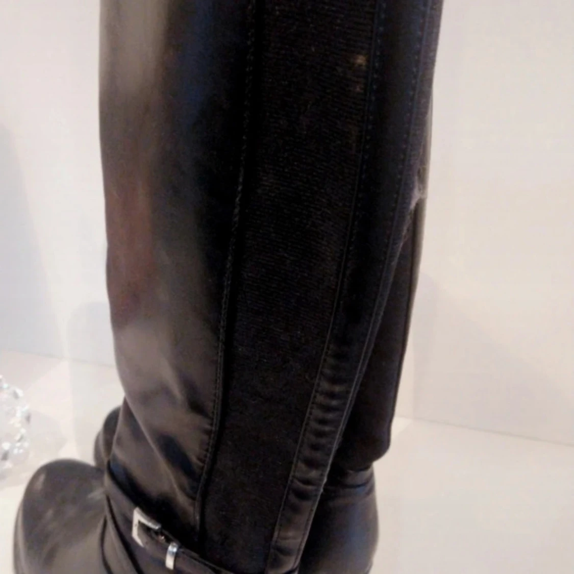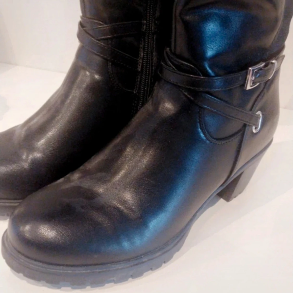 Säljer ett par svarta stövlar i skinn med en snygg spänndetalj på sidan. De är i allvädersmaterial vilket gör dem perfekta för både höst och vinter. Stövlarna har en robust sula och en liten klack för extra stil. Perfekta för att hålla fötterna torra och varma under de kallare månaderna.