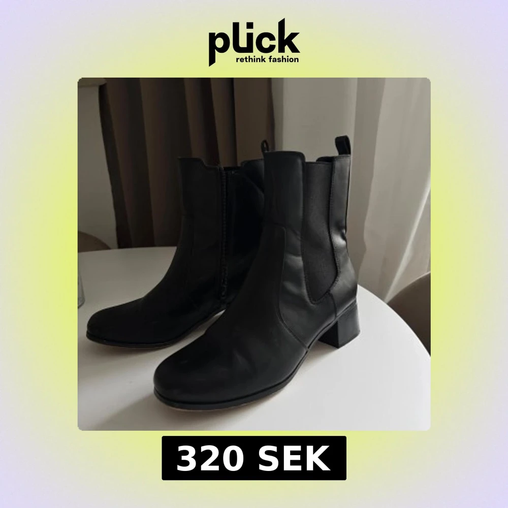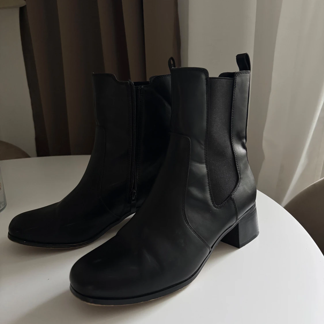 Säljer ett par svarta chelsea boots i skinnimitation med medelhög klack och rund tå. Skorna har resår på sidorna och dragkedja på insidan för enkel påtagning. Perfekta för en stilren look. Använda en gång i ca 2h.