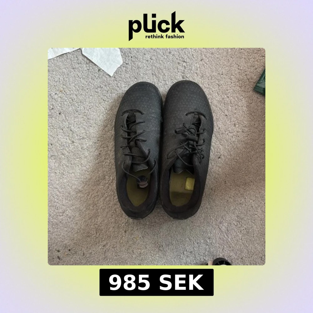 Säljer ett par svarta sneakers med snörning. Skorna har en stilren design med rund tå och är perfekta för vardagsbruk. De är tillverkade i syntetmaterial och har en bekväm passform.