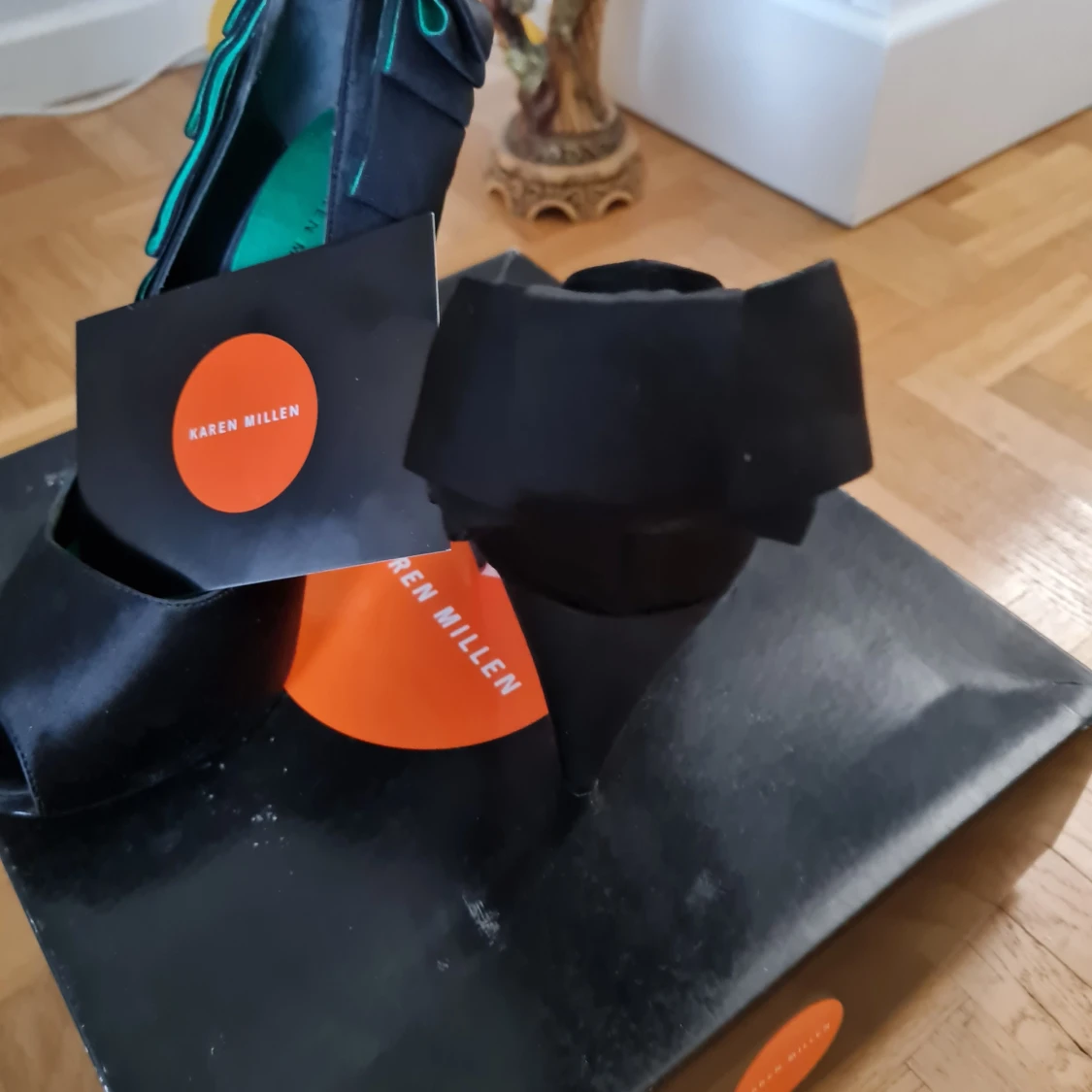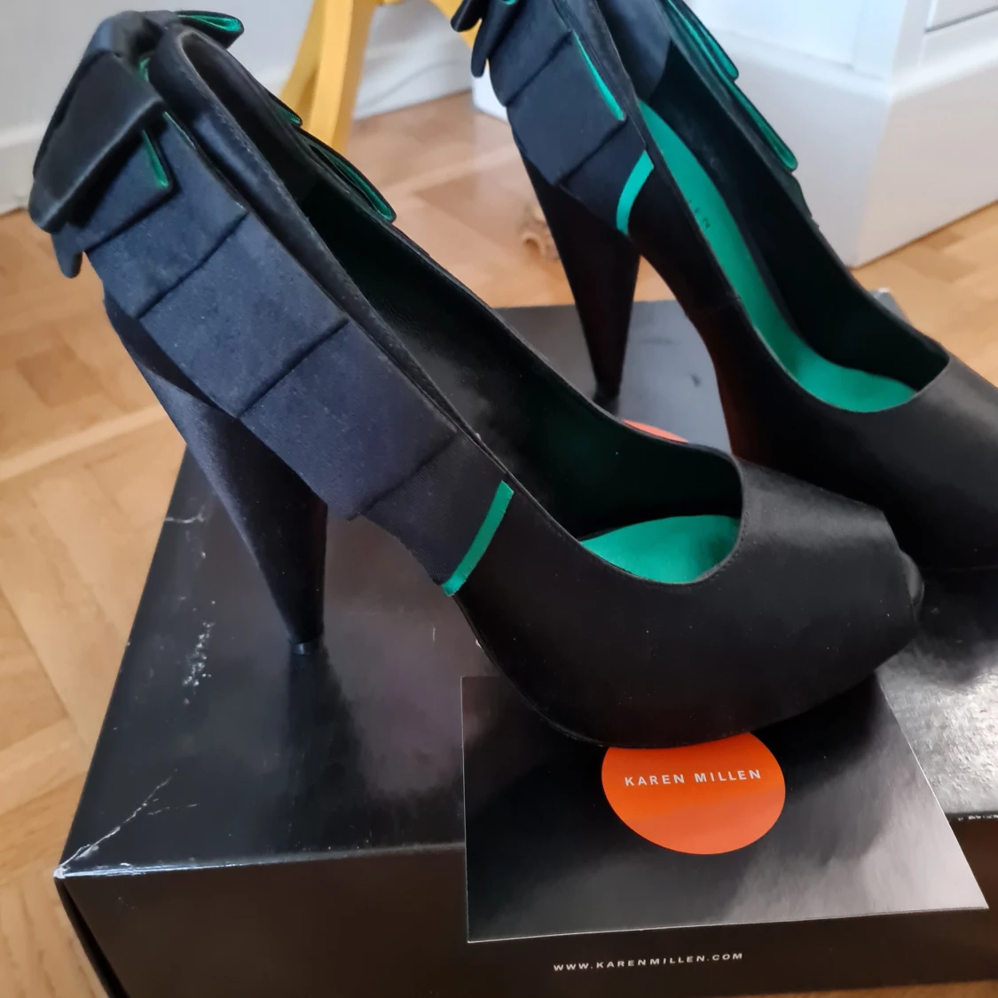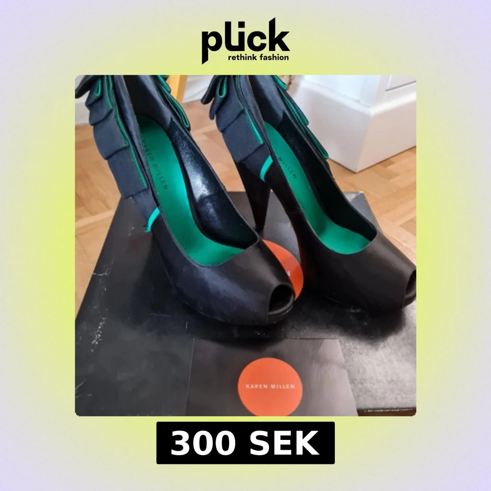 Eleganta svarta pumps från Karen Millen med öppen tå och unik volangdetalj på baksidan. Skorna har en stilren design med en kontrasterande grön insida som ger en modern touch.