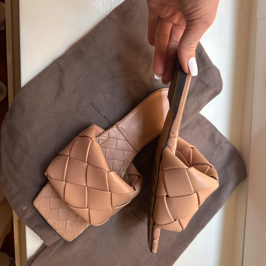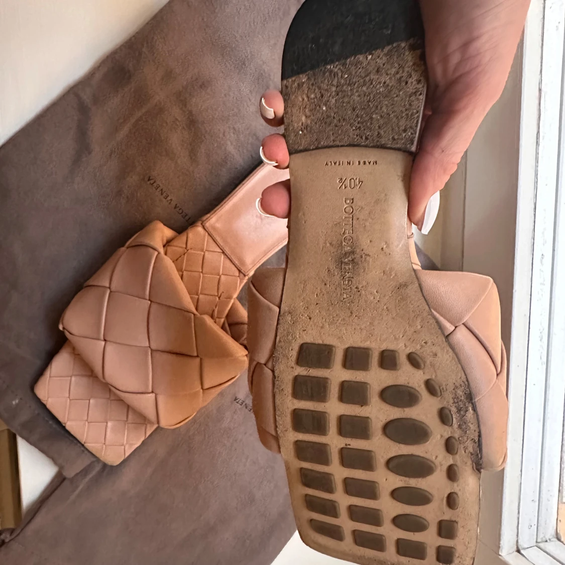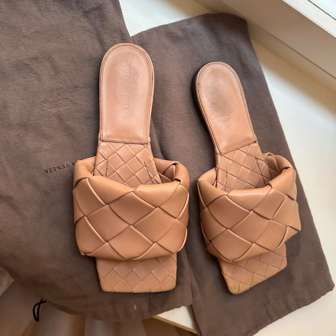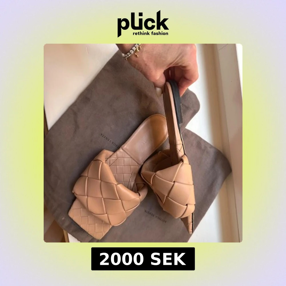 Snygga beige sandaler från Bottega Veneta med flätad design. Sandalerna har en fyrkantig tå och är tillverkade i skinn. Perfekta för en stilren look.
