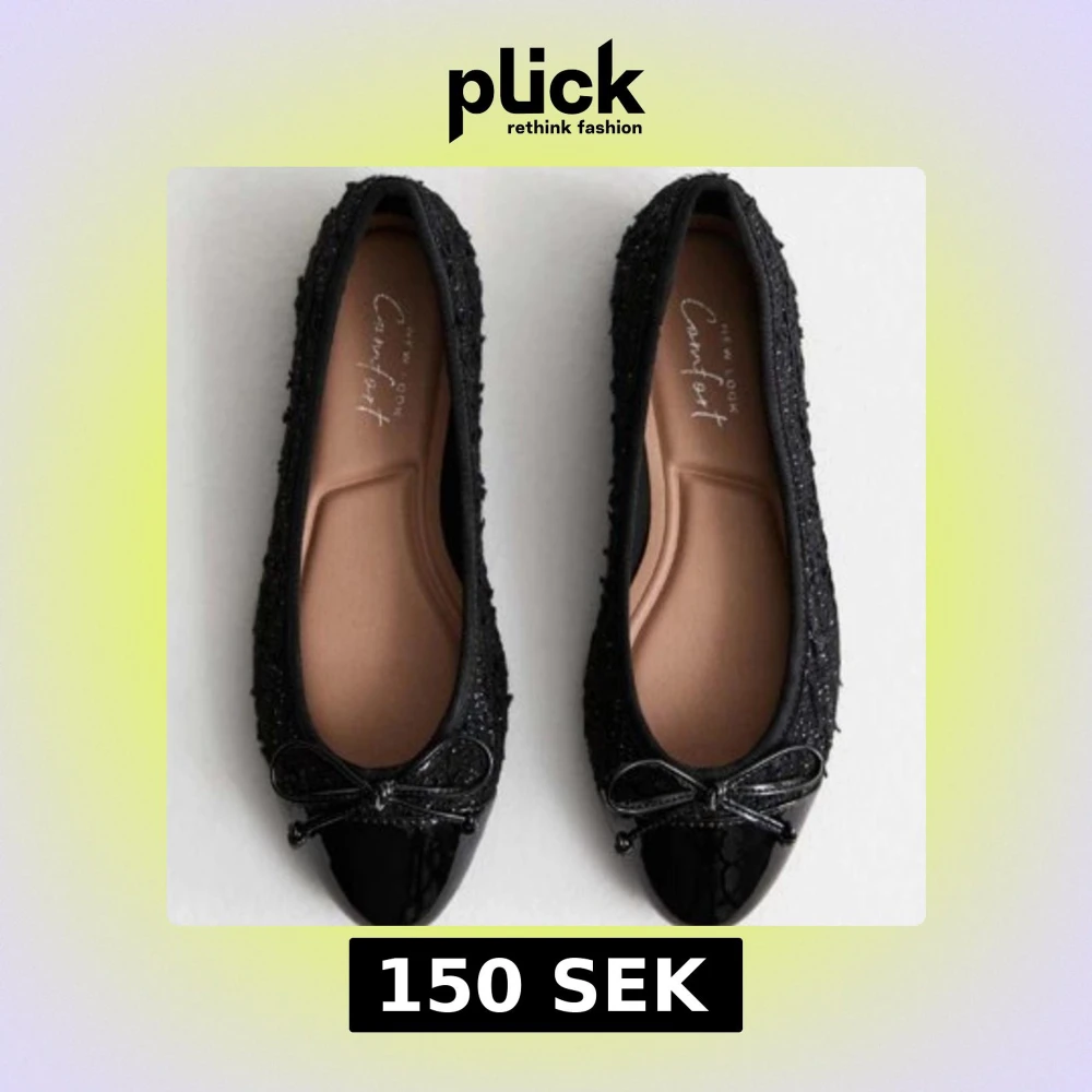 Snygga svarta ballerinaskor från New Look med glittrig yta och en söt rosett på tån. Perfekta för att ge en elegant touch till din outfit. Skorna har en bekväm passform och är lätta att bära hela dagen. Dem har varit använda 1 gång💗💗